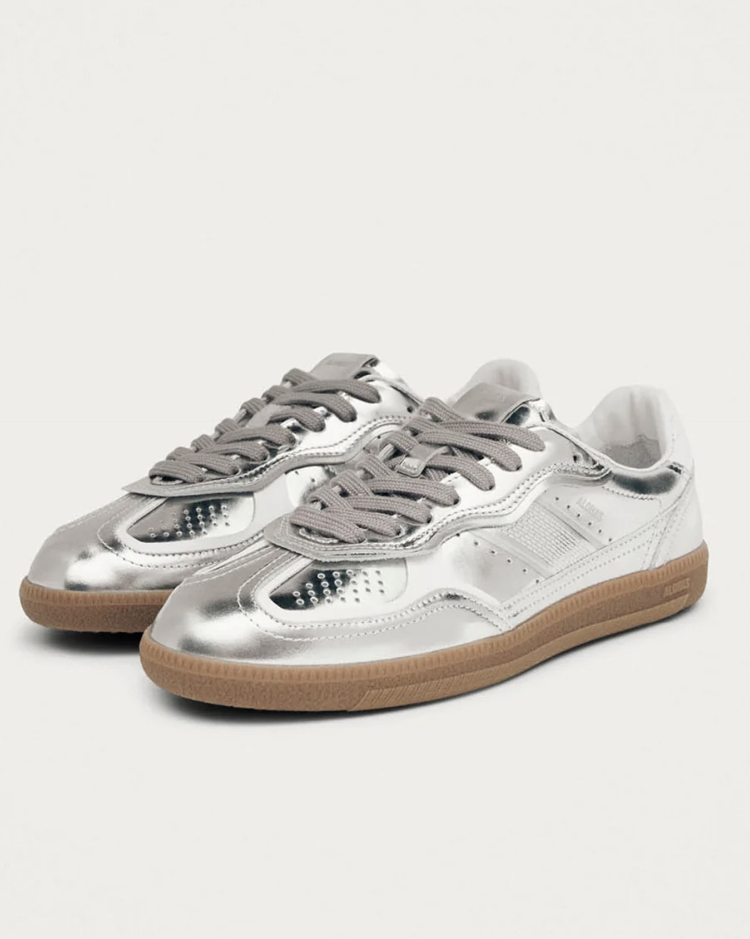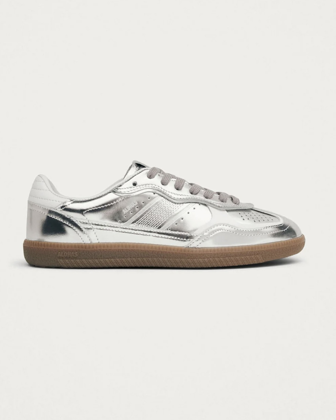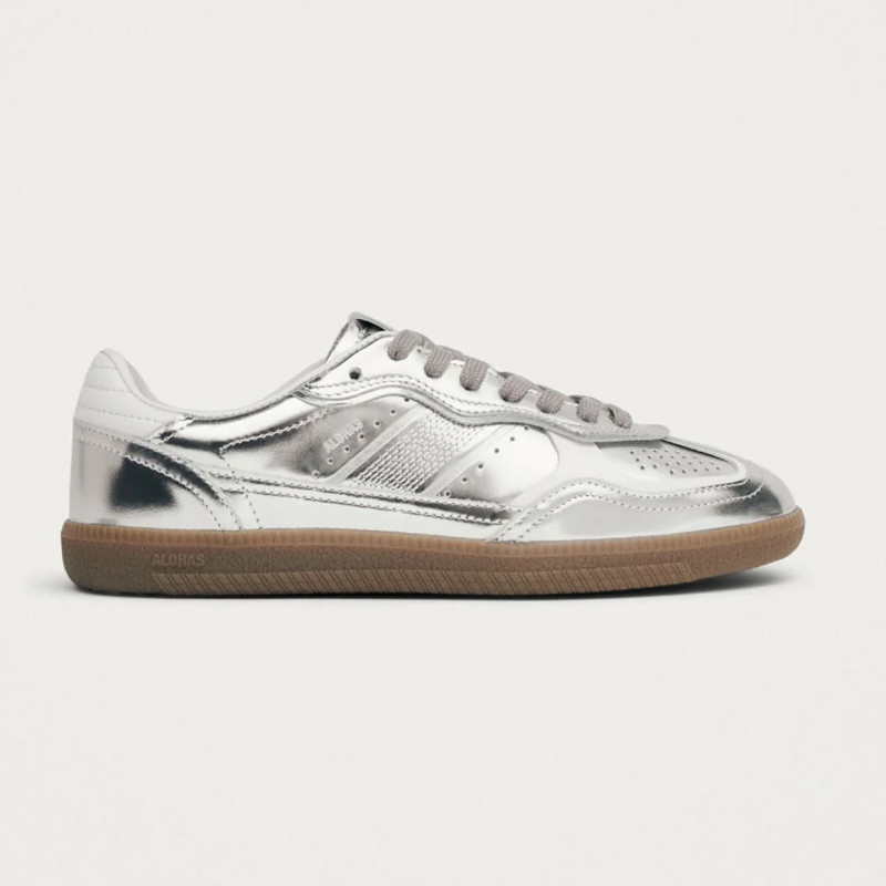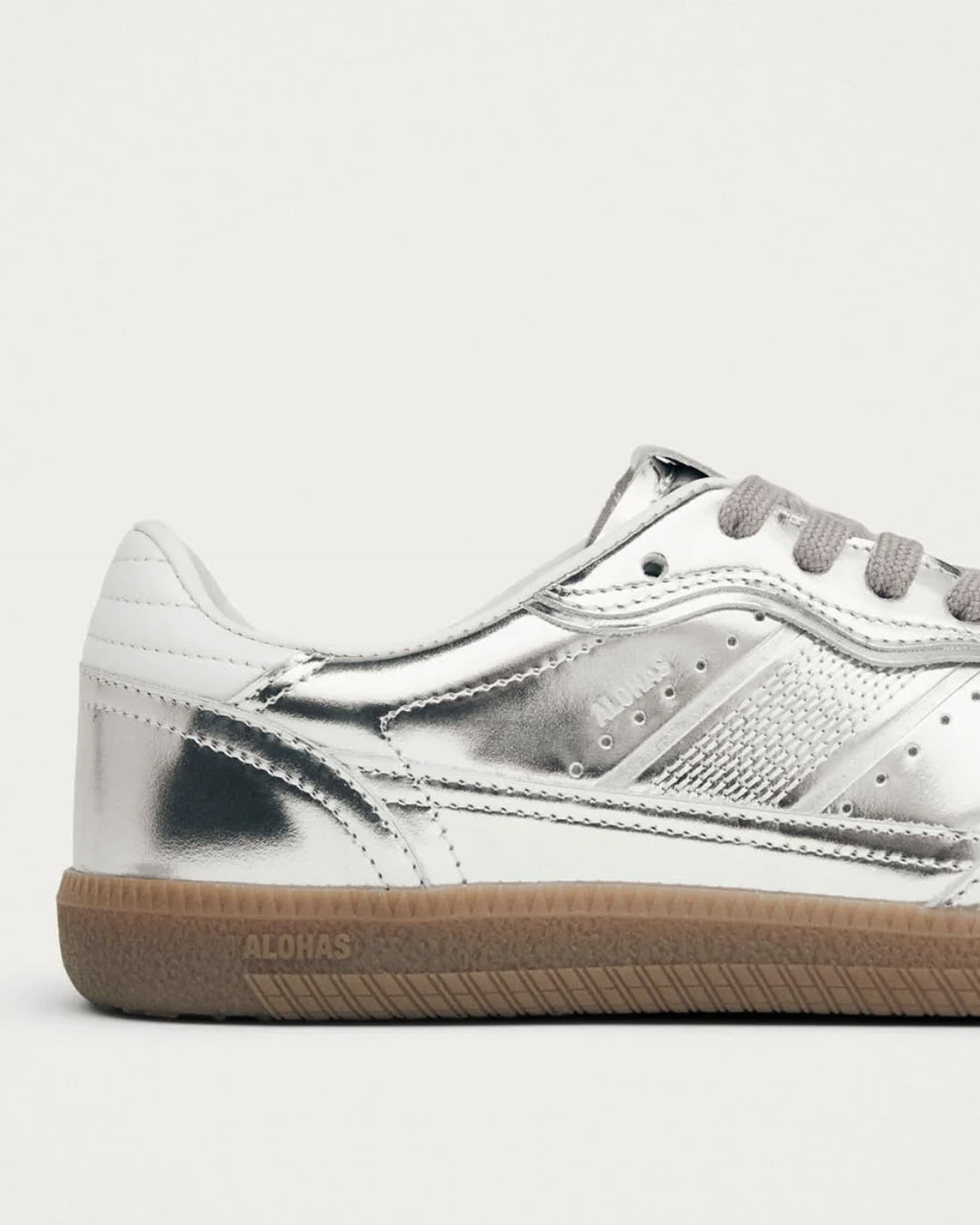 Finition métallique, la sneaker Tb.490 est fabriqué en cuir argenté qui a un éclat verni.