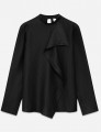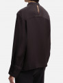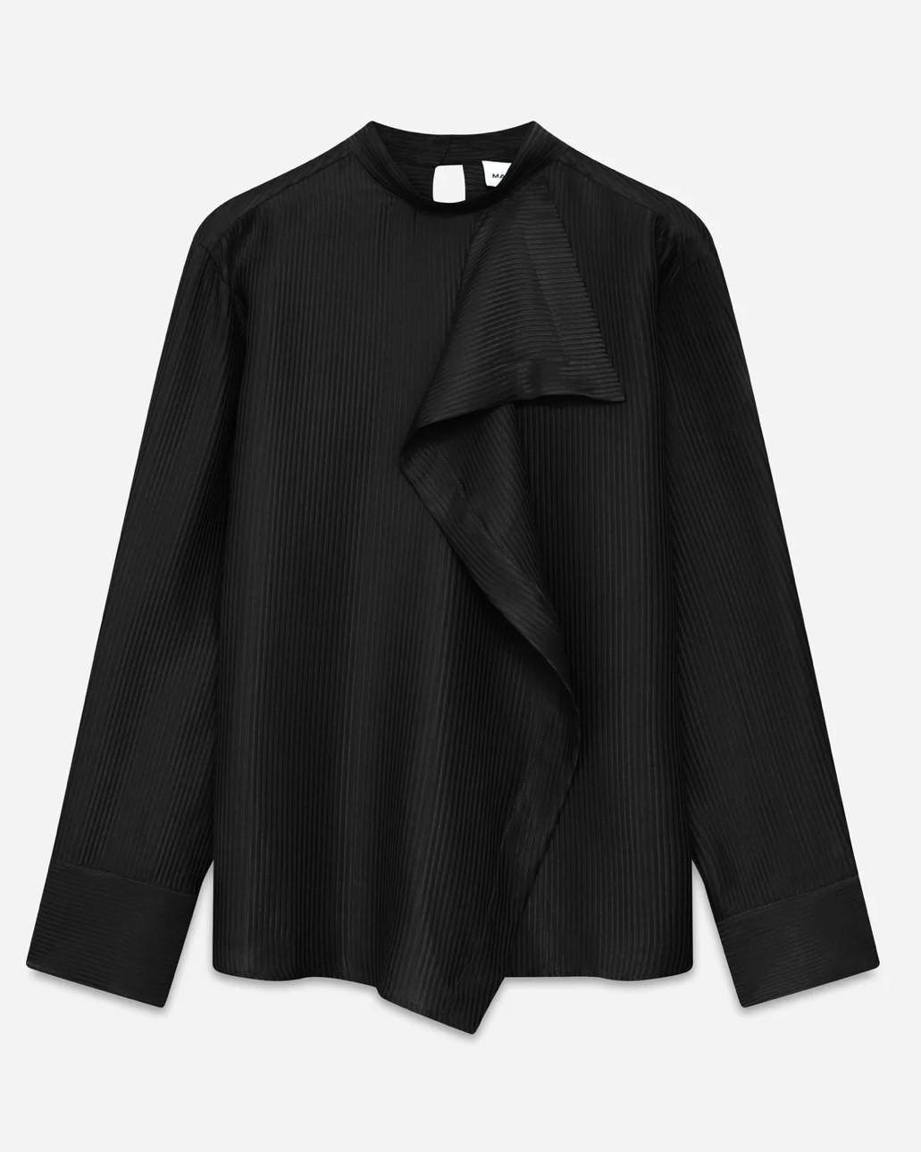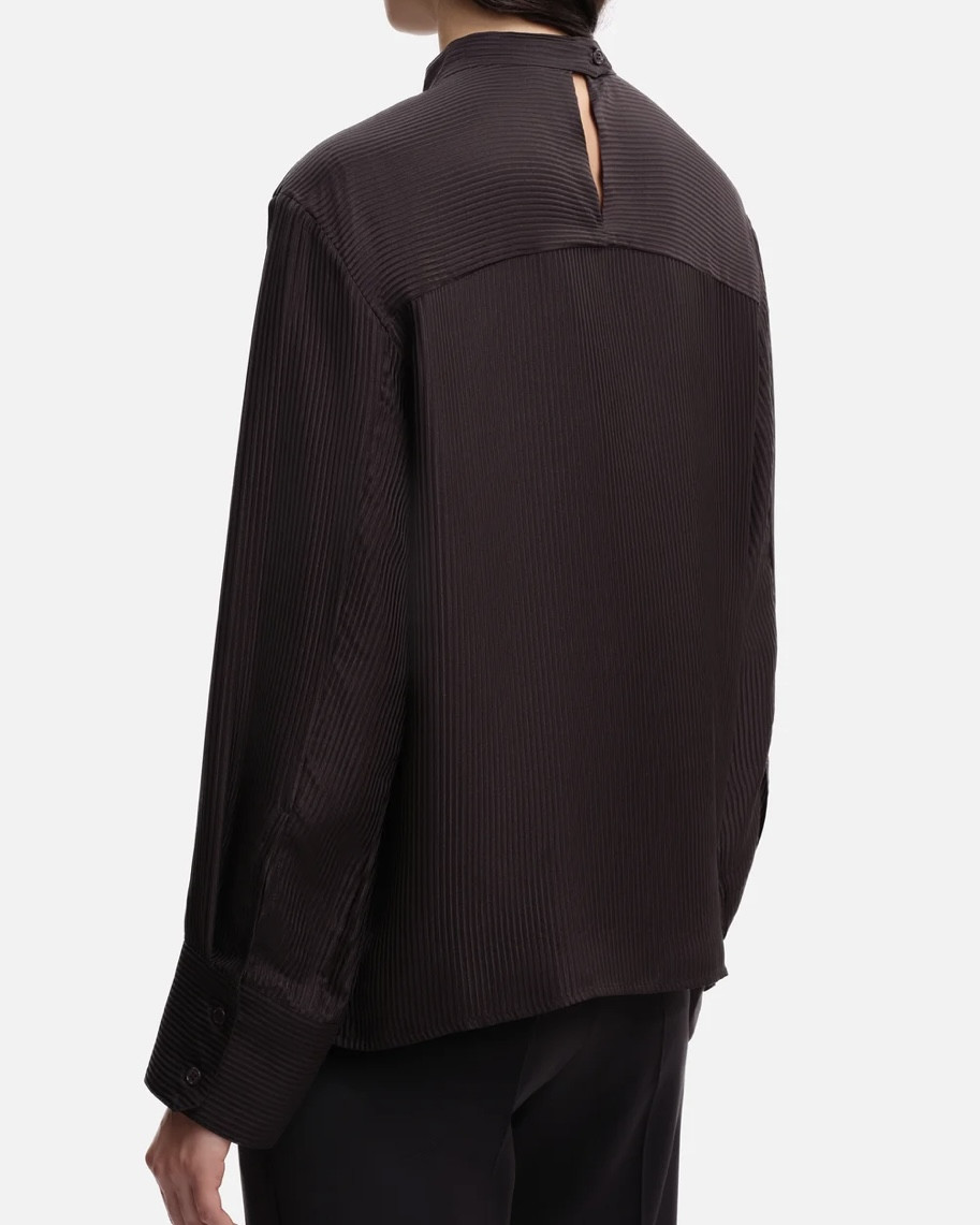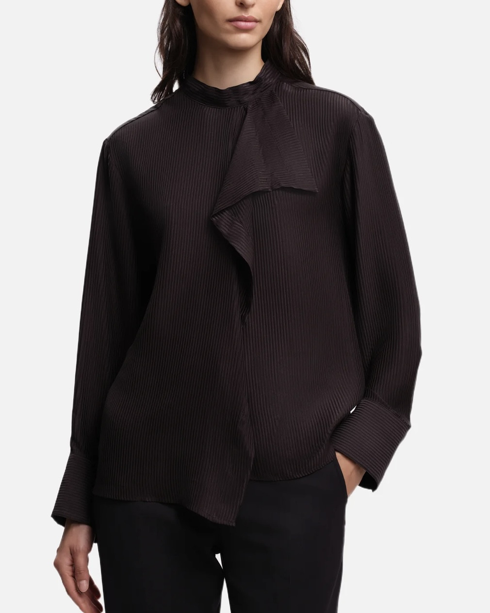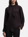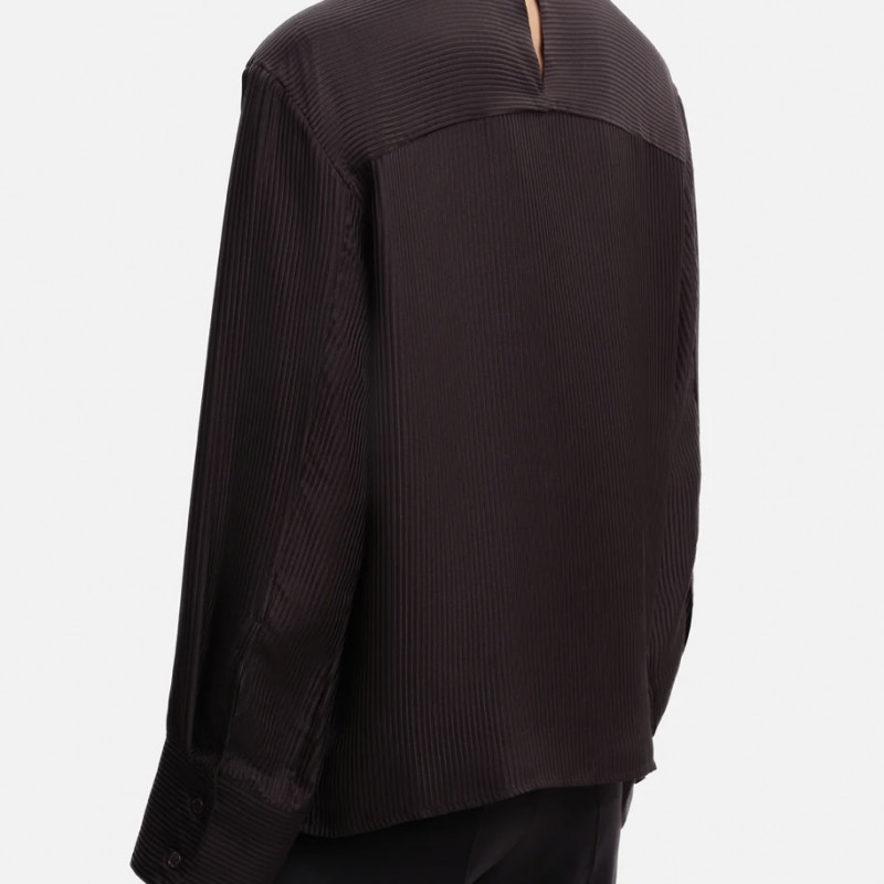 Chemise à volant en 100% soie, coupe asymétrique avec col rond boutonné au dos, fente milieu dos, manches longues à poignets boutonnés et empiècement au dos.