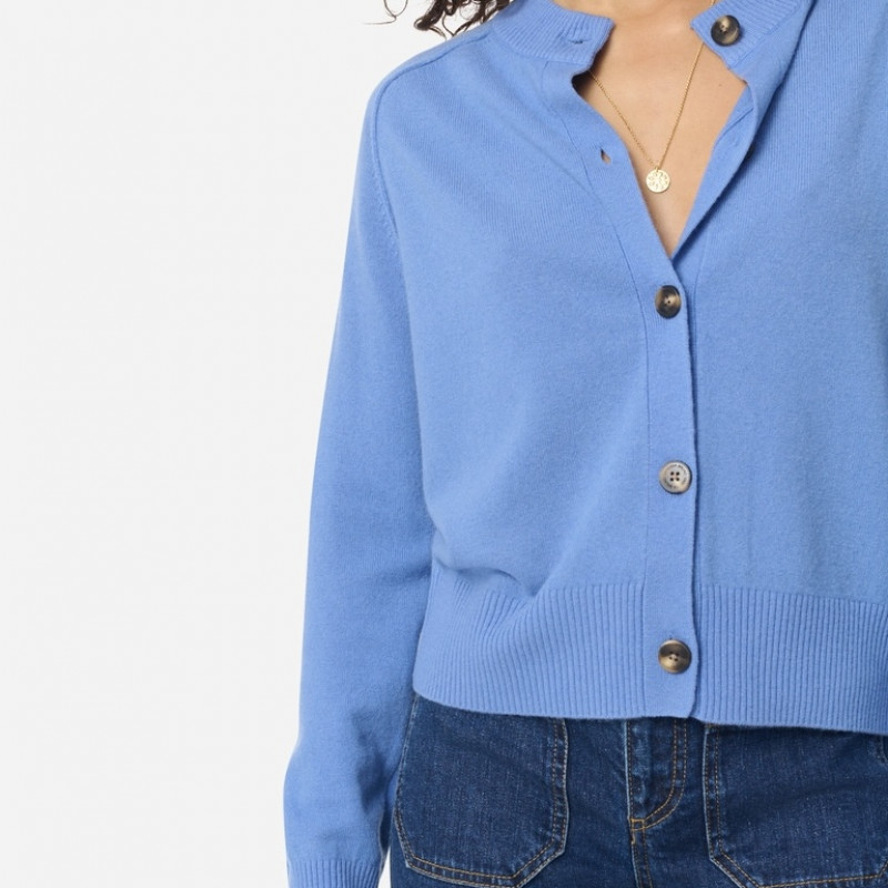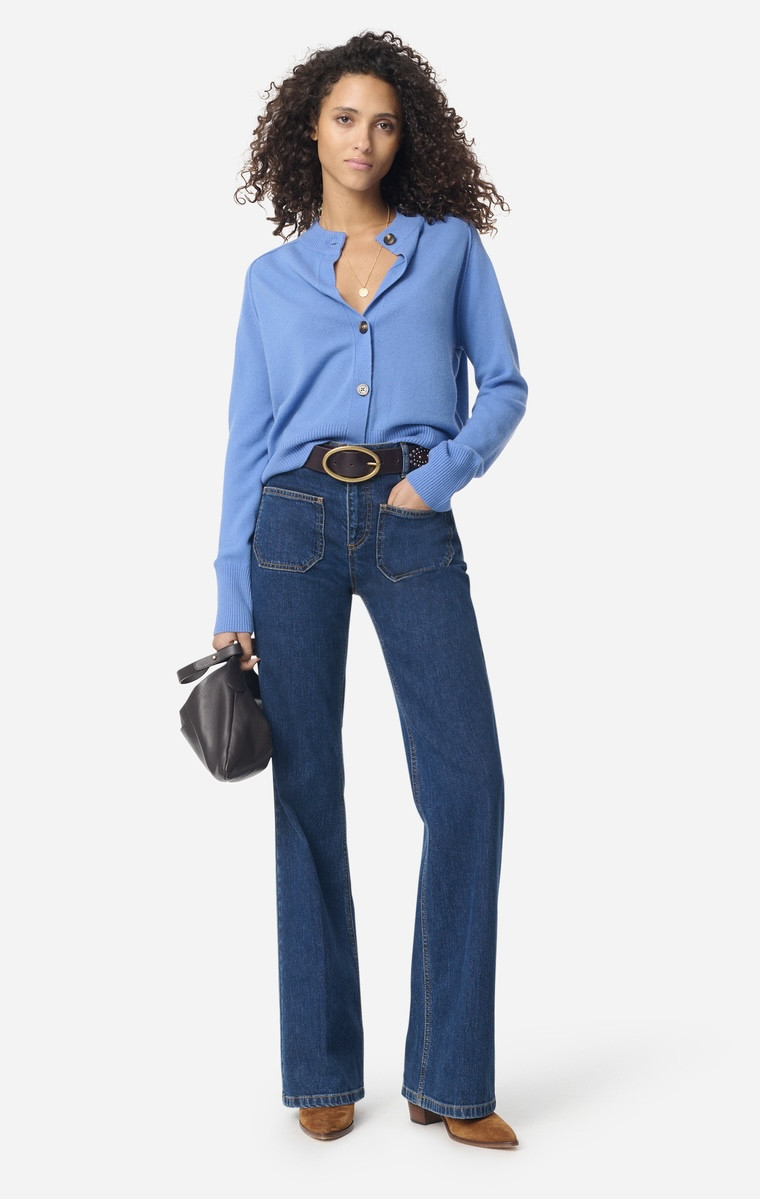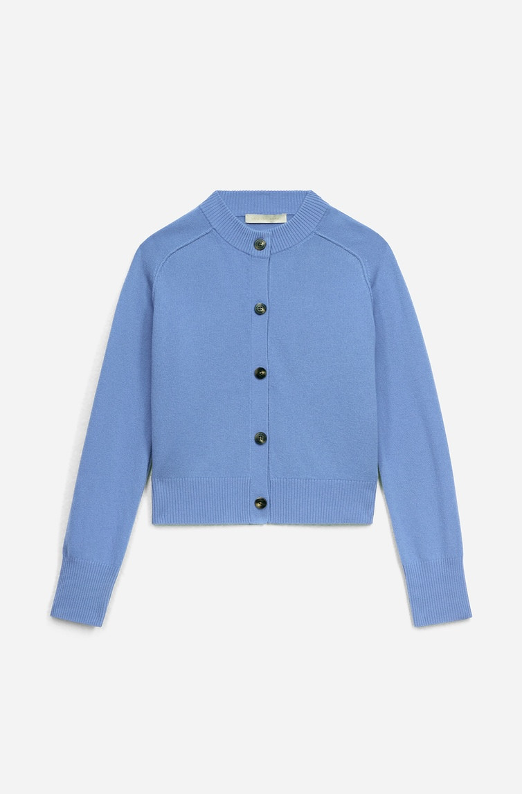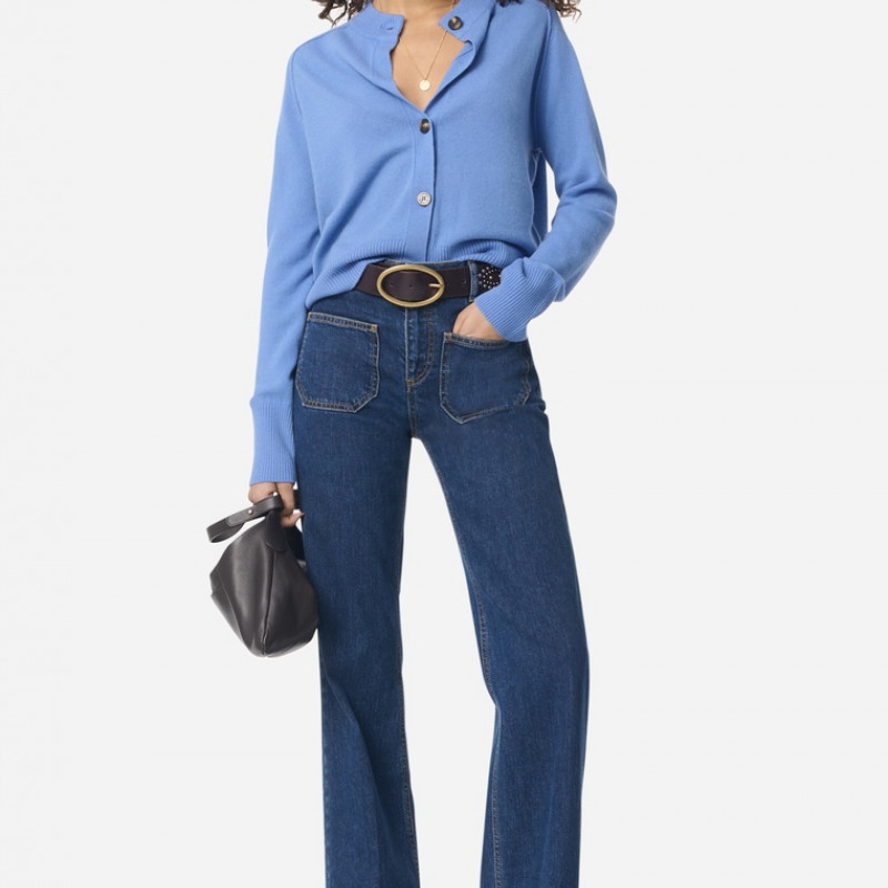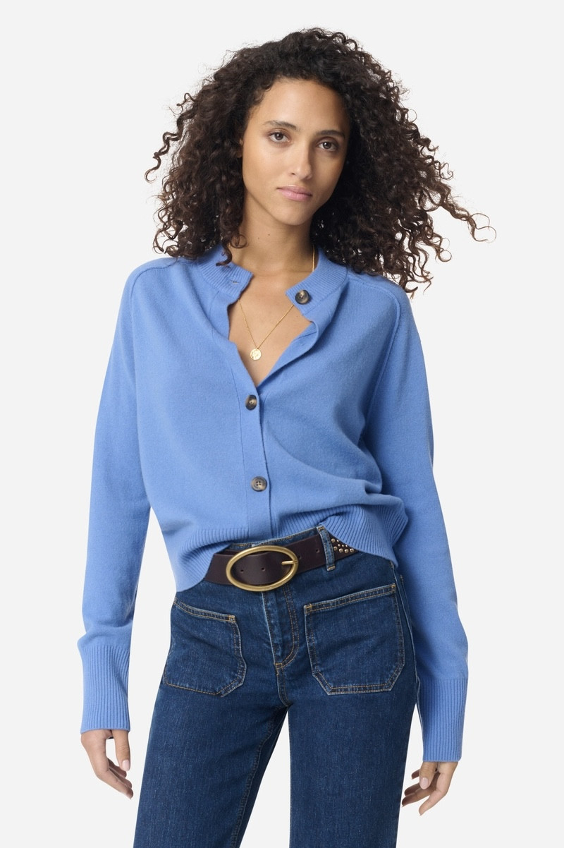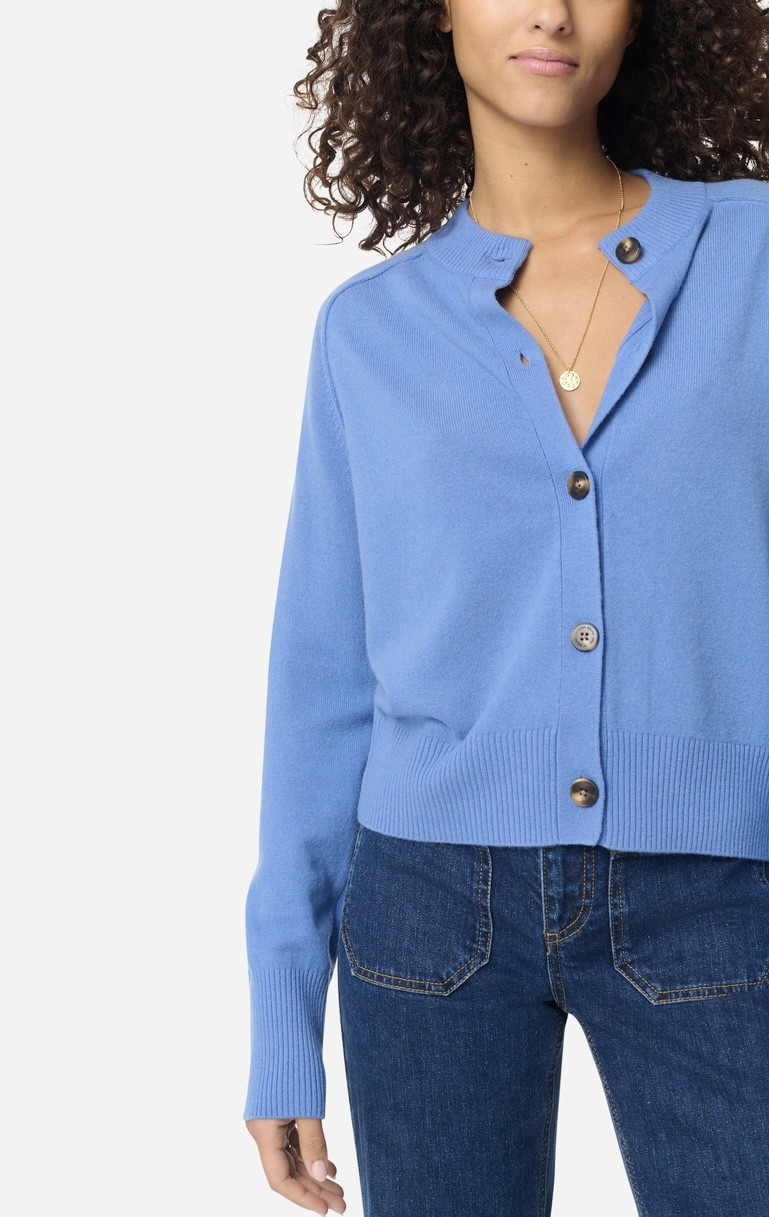 Un cardigan structuré au charme discret, porté par une coupe droite et des boutons aspects corne.