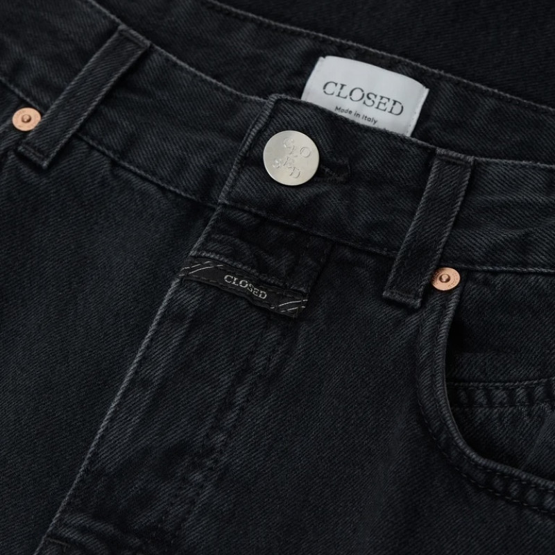 Denim Style Nikka en coupe large avec une braguette boutonnée, fabriqué en Italie en denim noir de poids moyen (11 oz.) avec effet salt 'n pepper. Hauteur de taille moyenne et jambes amples. Le denim italien de qualité supérieure est en pur coton bio, tissé dans l'atelier de tissage italien mondialement connu Candiani. Fait partie de notre ligne d'éco-denim A BETTER BLUE et est fabriqué à 100 pour cent en Italie.