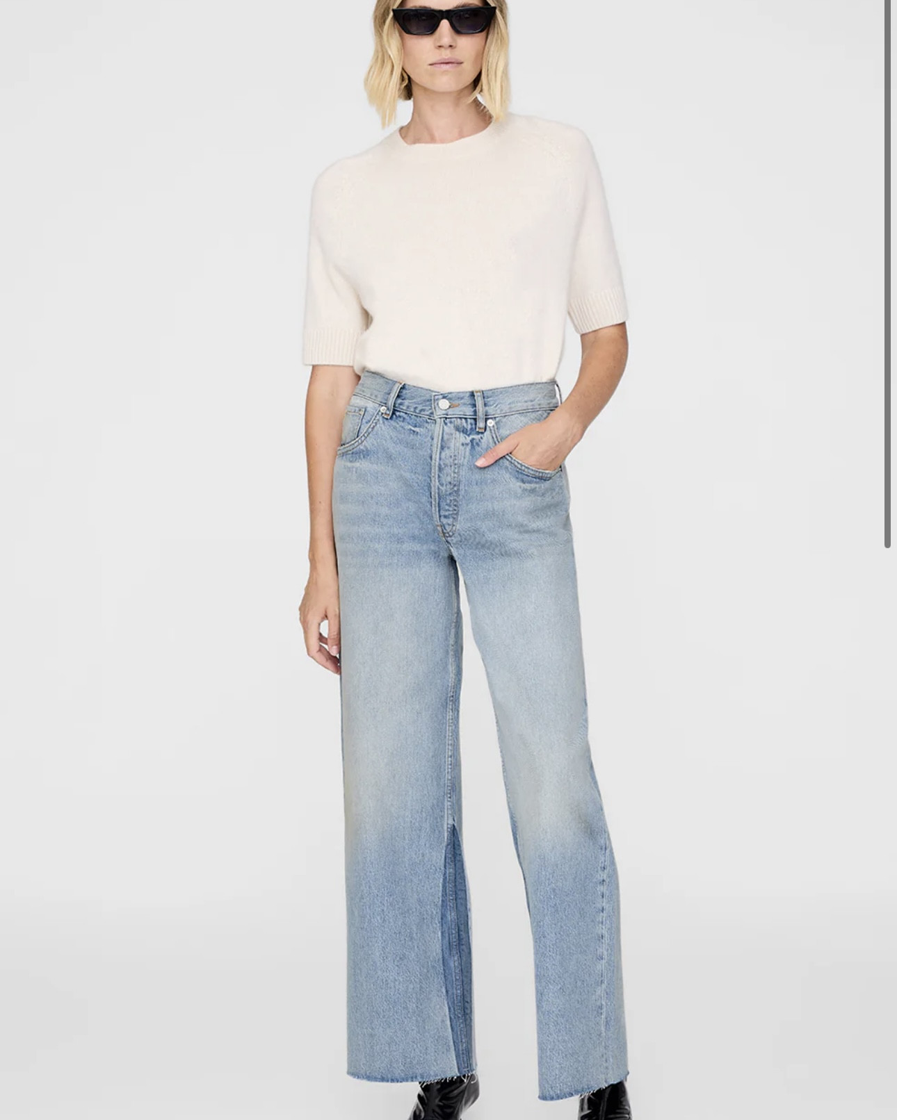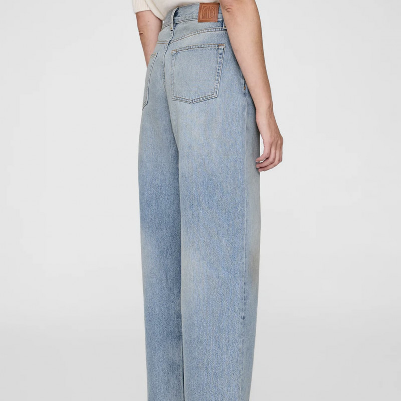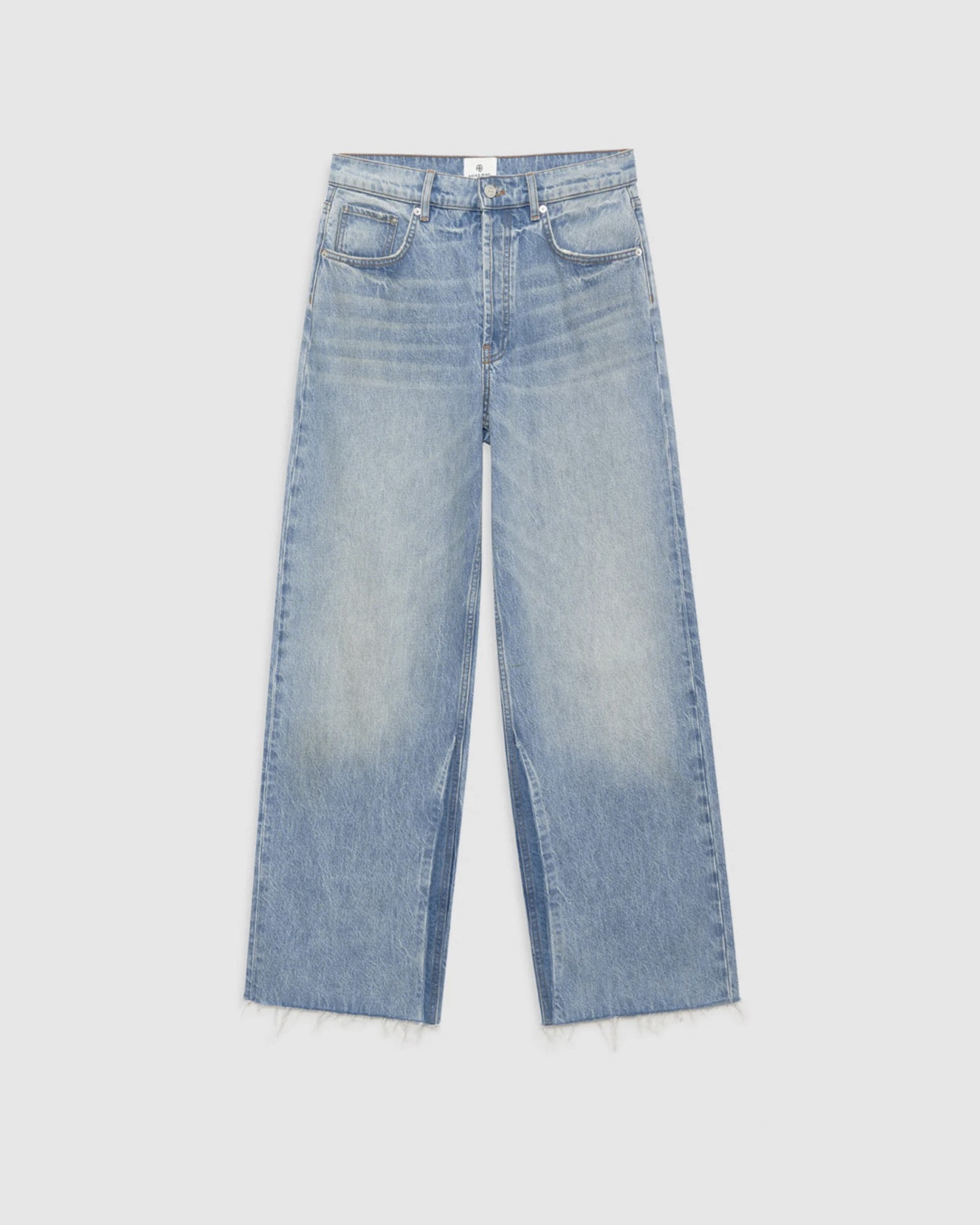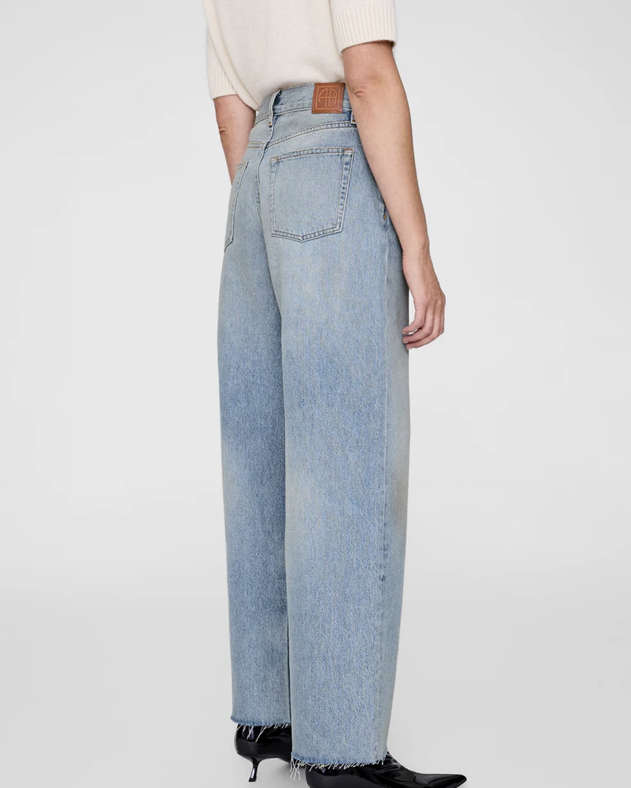 Le jean Manon présente une silhouette ample construite à partir de denim régénérant rigide de coton de poids moyen sans stretch dans un lavage bleu moyen.