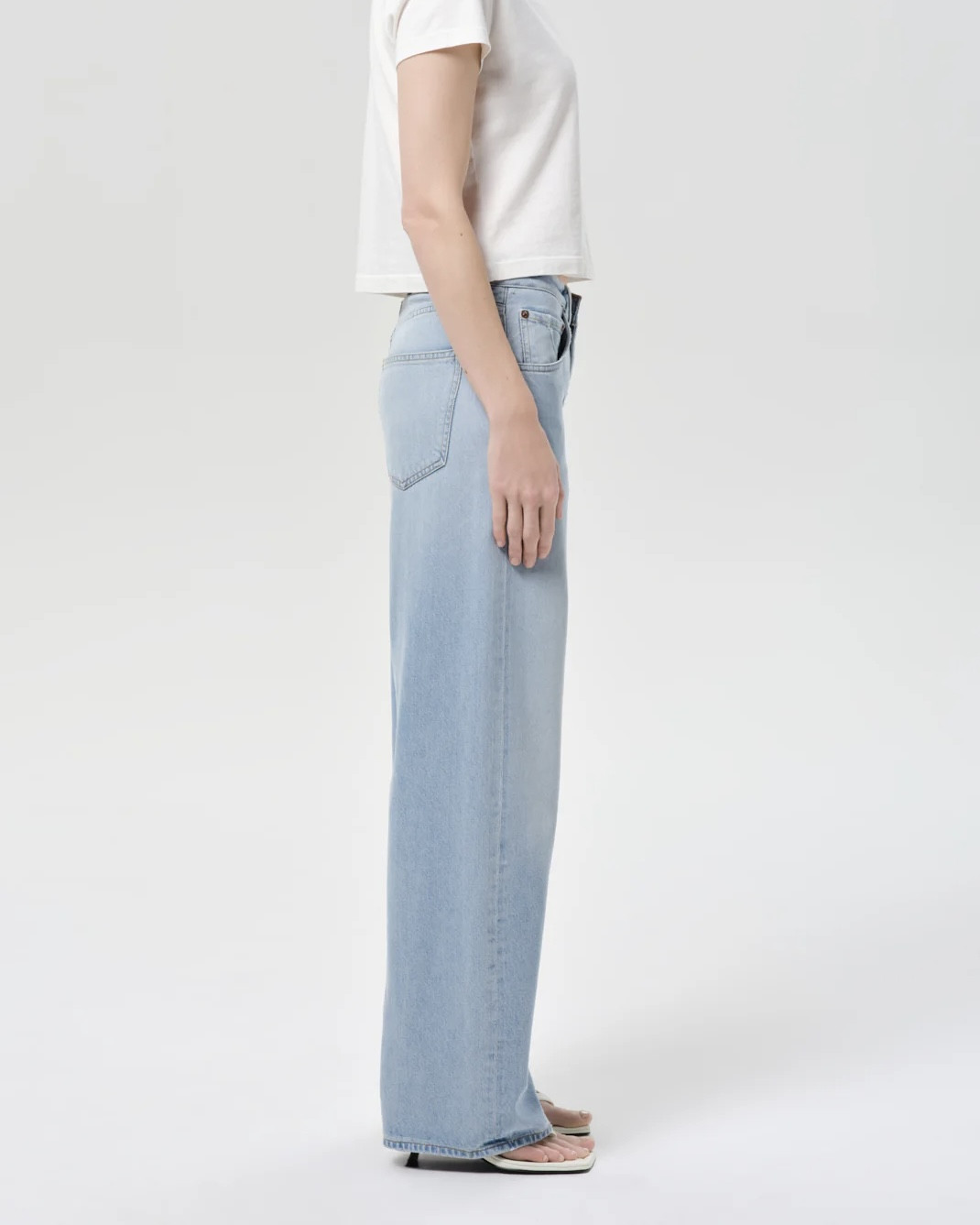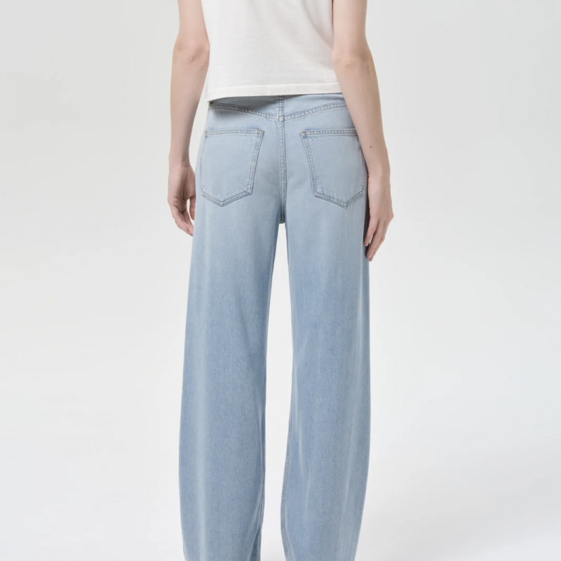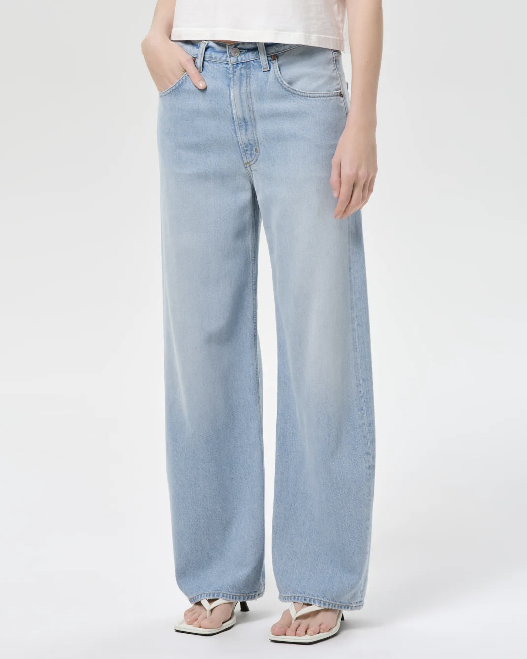 Jean souple, taille mi-haute, coupe : jambes arrondies.