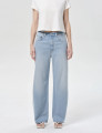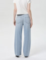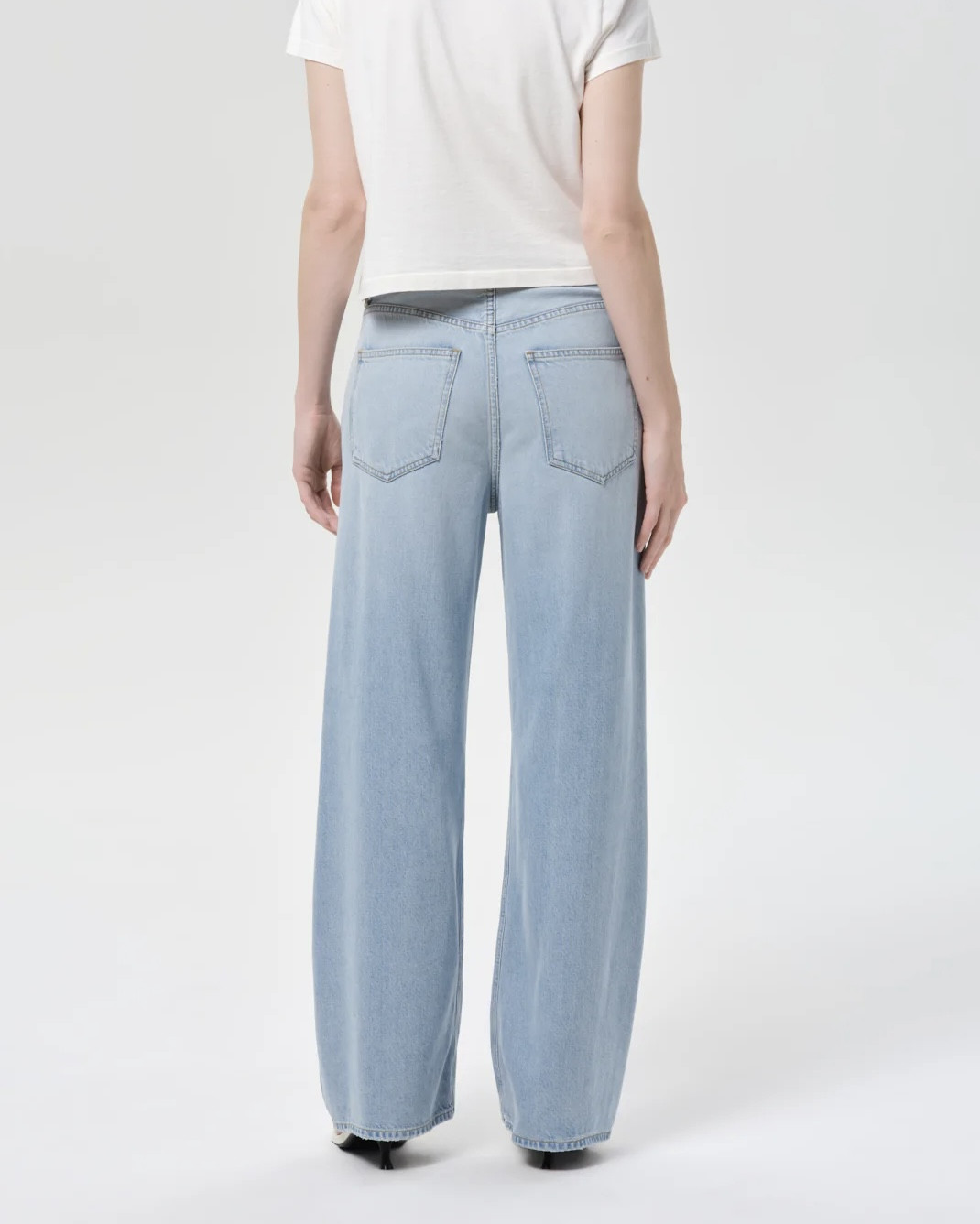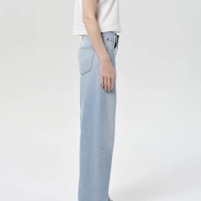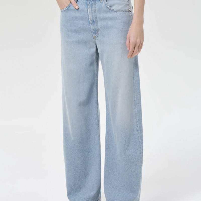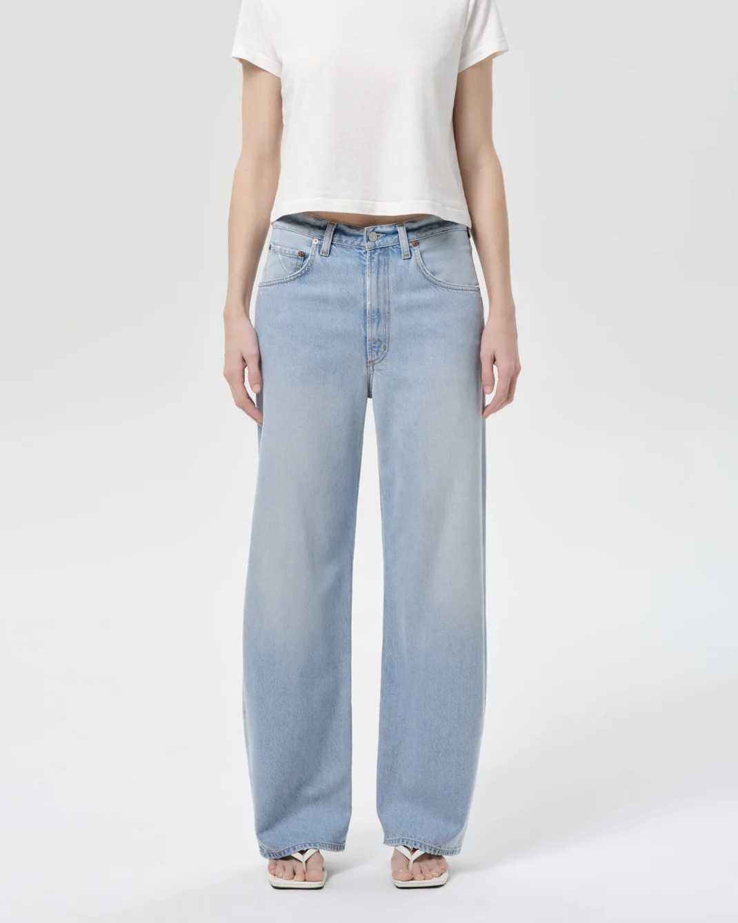 Jean souple, taille mi-haute, coupe : jambes arrondies.