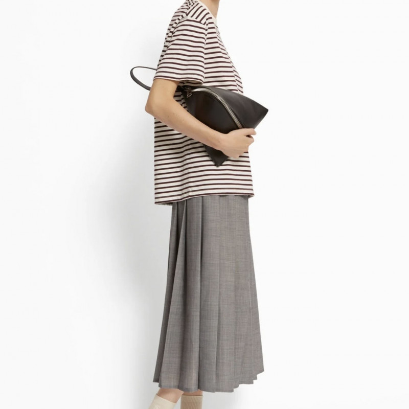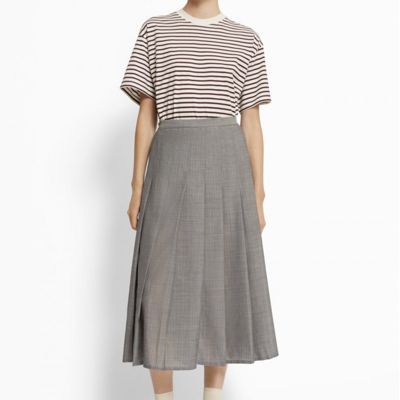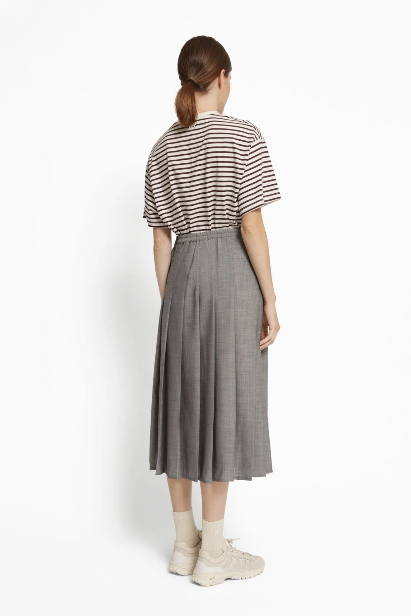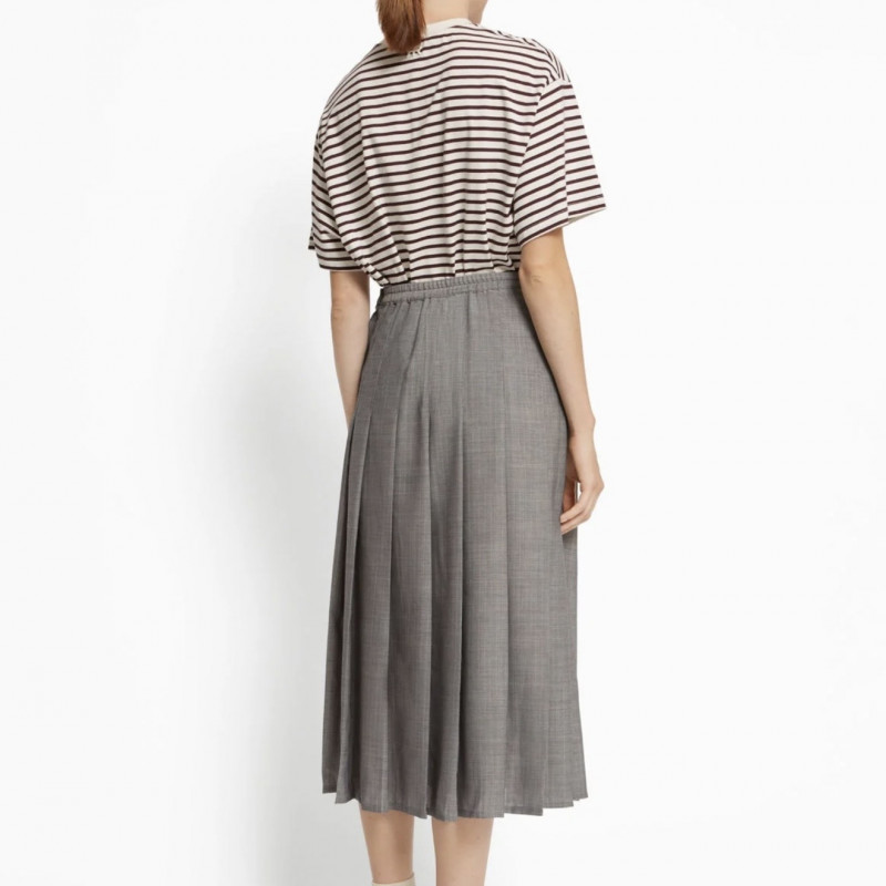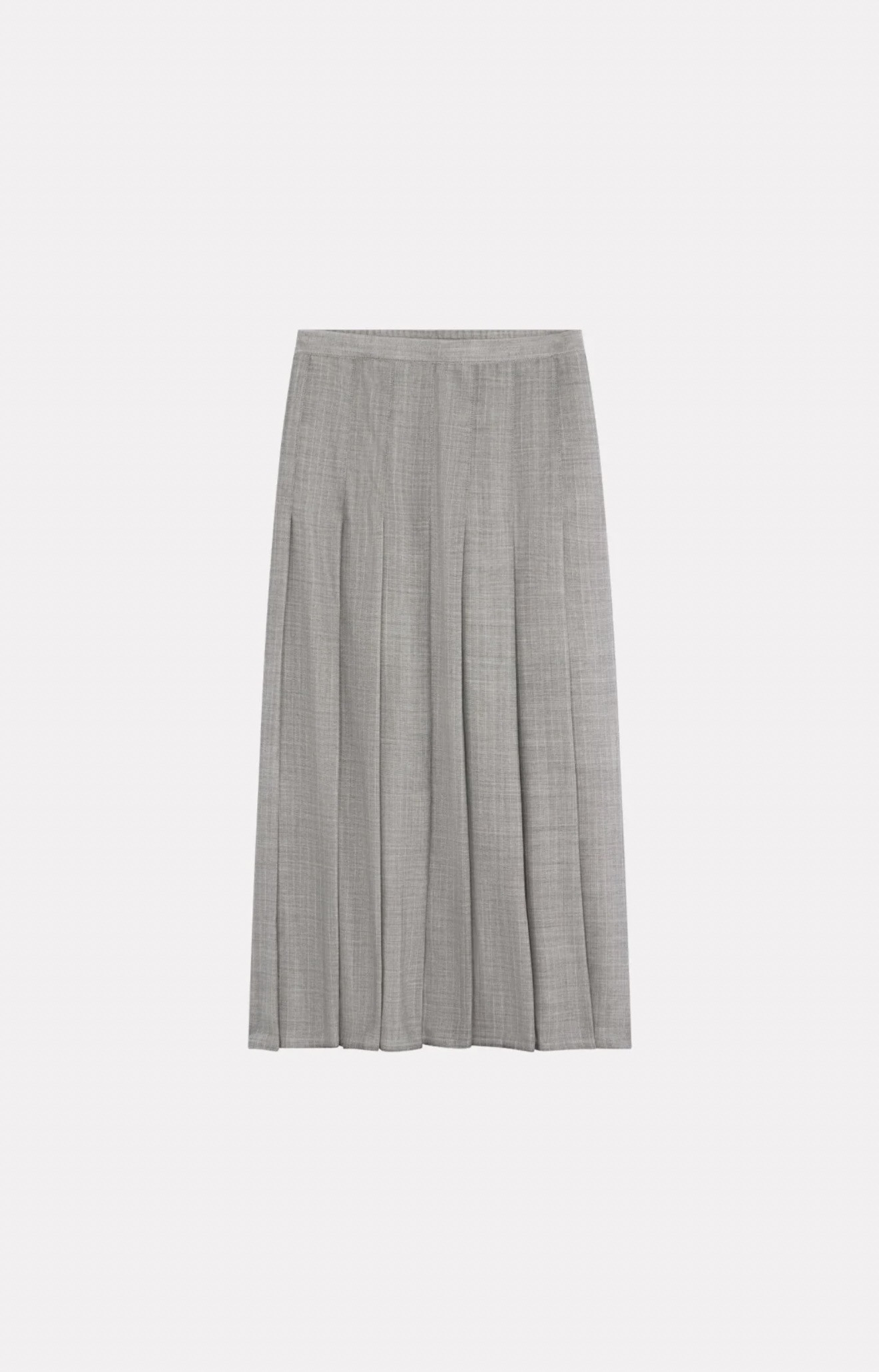 Jupe plissée réalisée en laine d’été technique ultra-fine, qui garantit un plissé permanent. Modèle longueur midi, se portant à la taille, avec taille dos élastique & trois fentes : deux côtés et une au milieu devant.