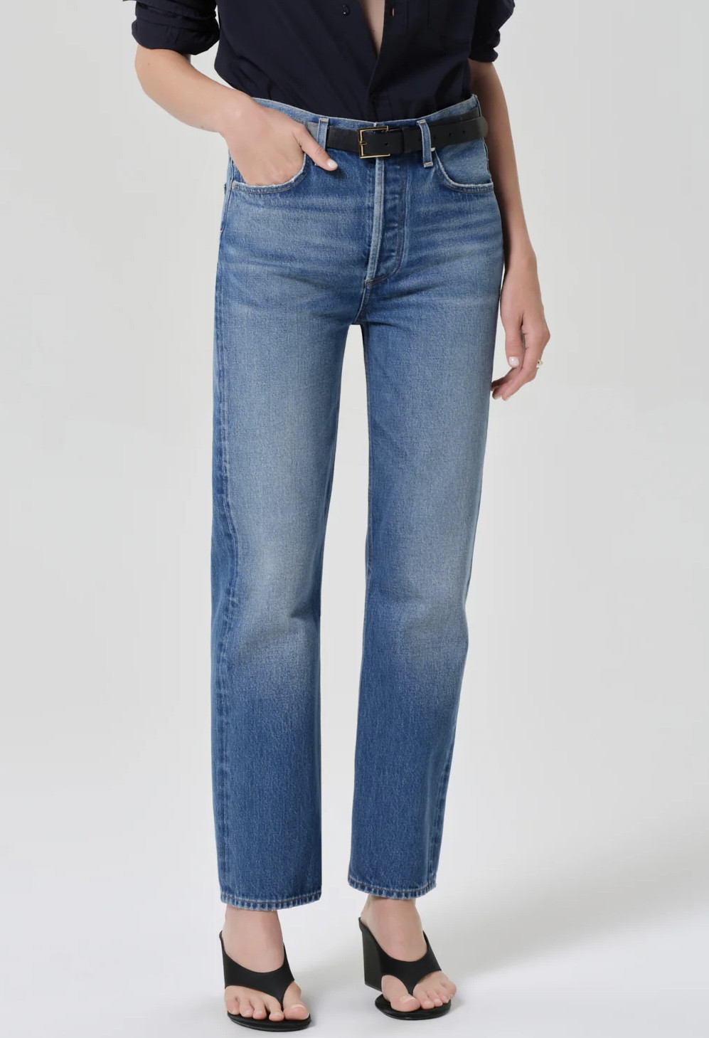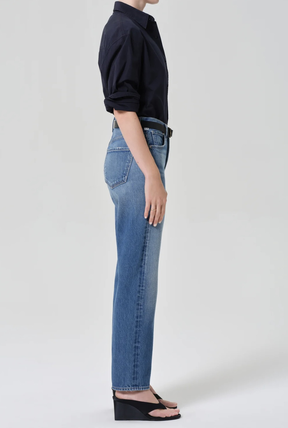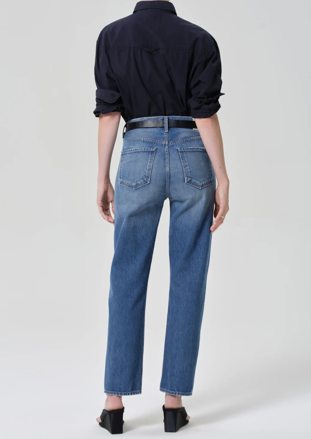 Le ‘Blaine’ est une jambe droite d’inspiration vintage à grande hauteur avec un entrejambe long de la cheville et une structure sans effort. Le lavage « Jonie » est un indigo moyen avec des moustaches douces, fabriqué à partir de denim en coton régénératif non extensible qui est lavé pour une sensation légère et ultra-douce. Style avec un tailoring décontracté ou une maille fine pour un look de tous les jours relevé.