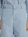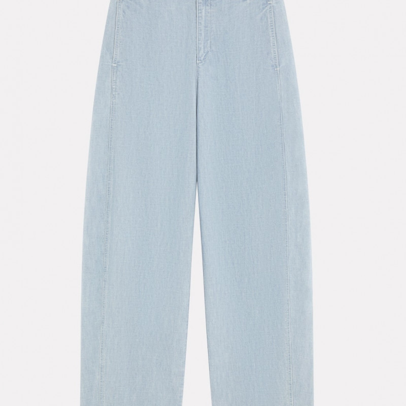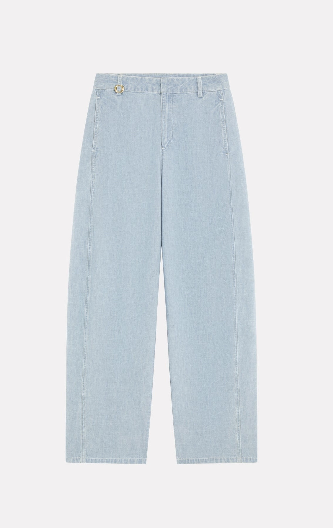 Pantalon taille haute présentant une coupe arrondie et ample sur la jambe, des plis marqués sur le devant, une braguette zippée, des passants à la taille, des poches non visibles ainsi qu'un passant métallique doré débossé Roseanna. Il est doté de boutons de resserrage à l’intérieur de la taille.