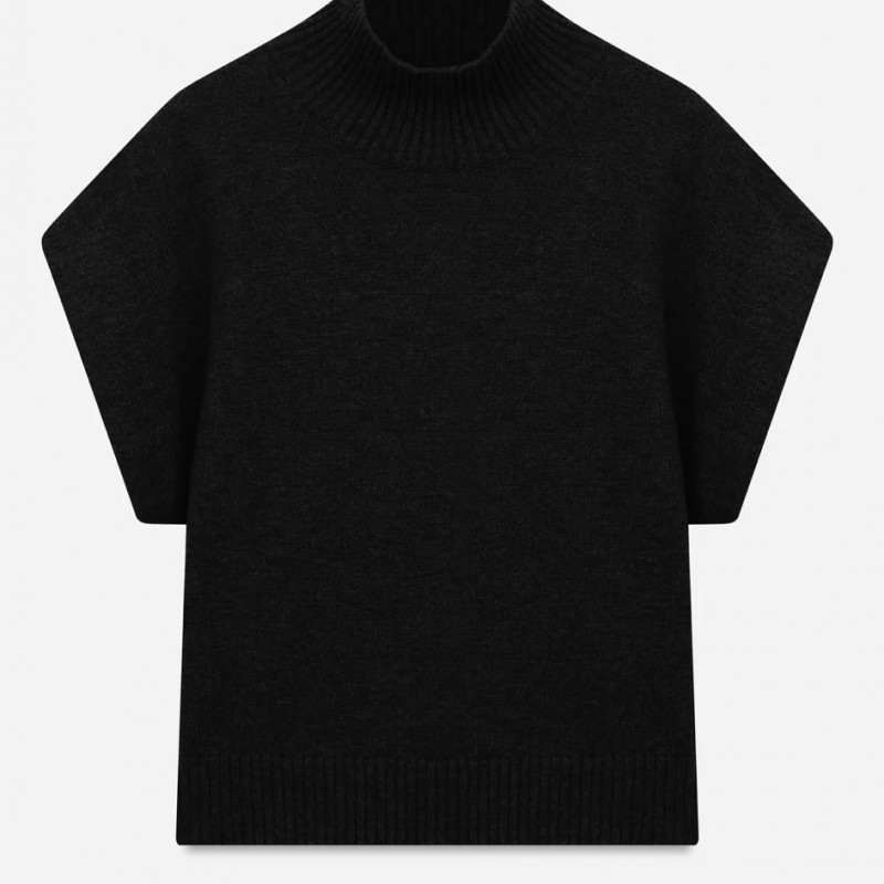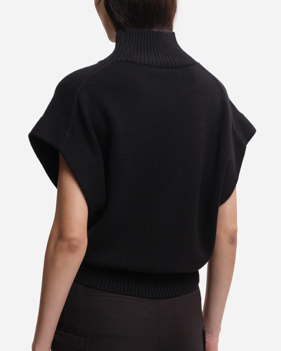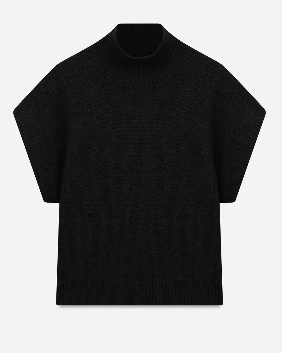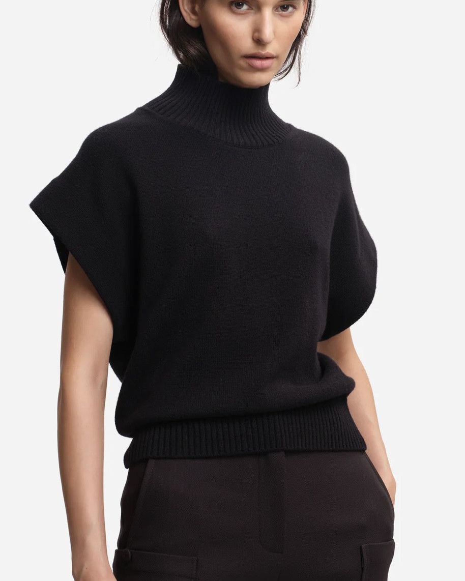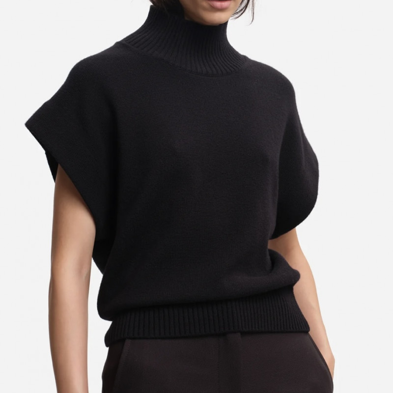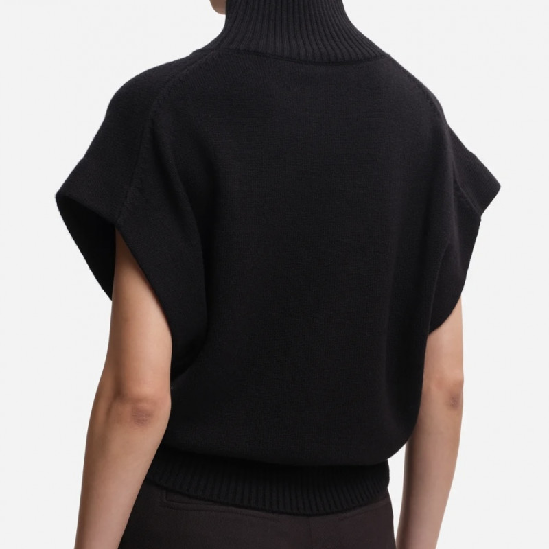 Annika, le pull sans manches à col montant qui signe une silhouette minimaliste et sophistiquée.