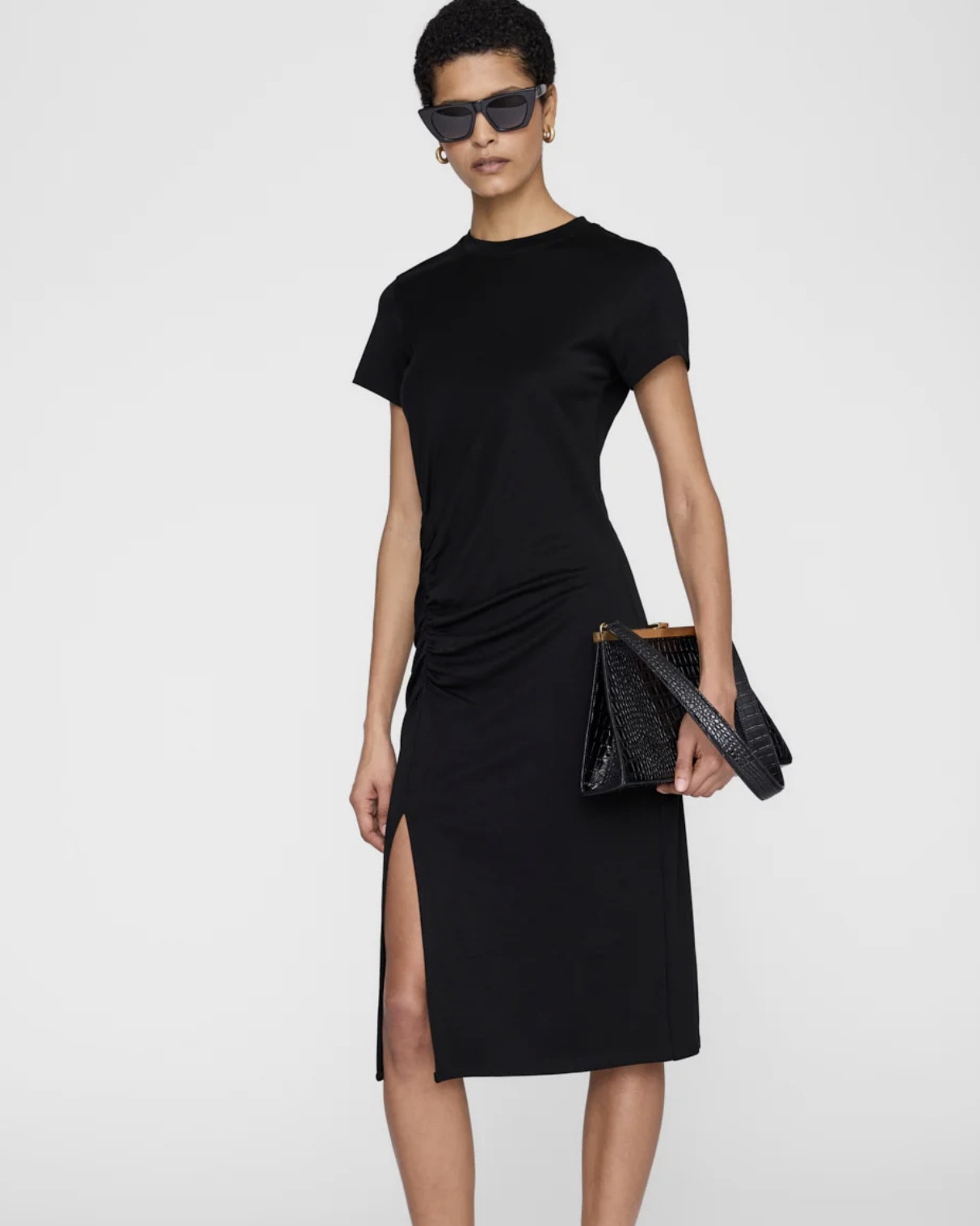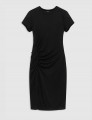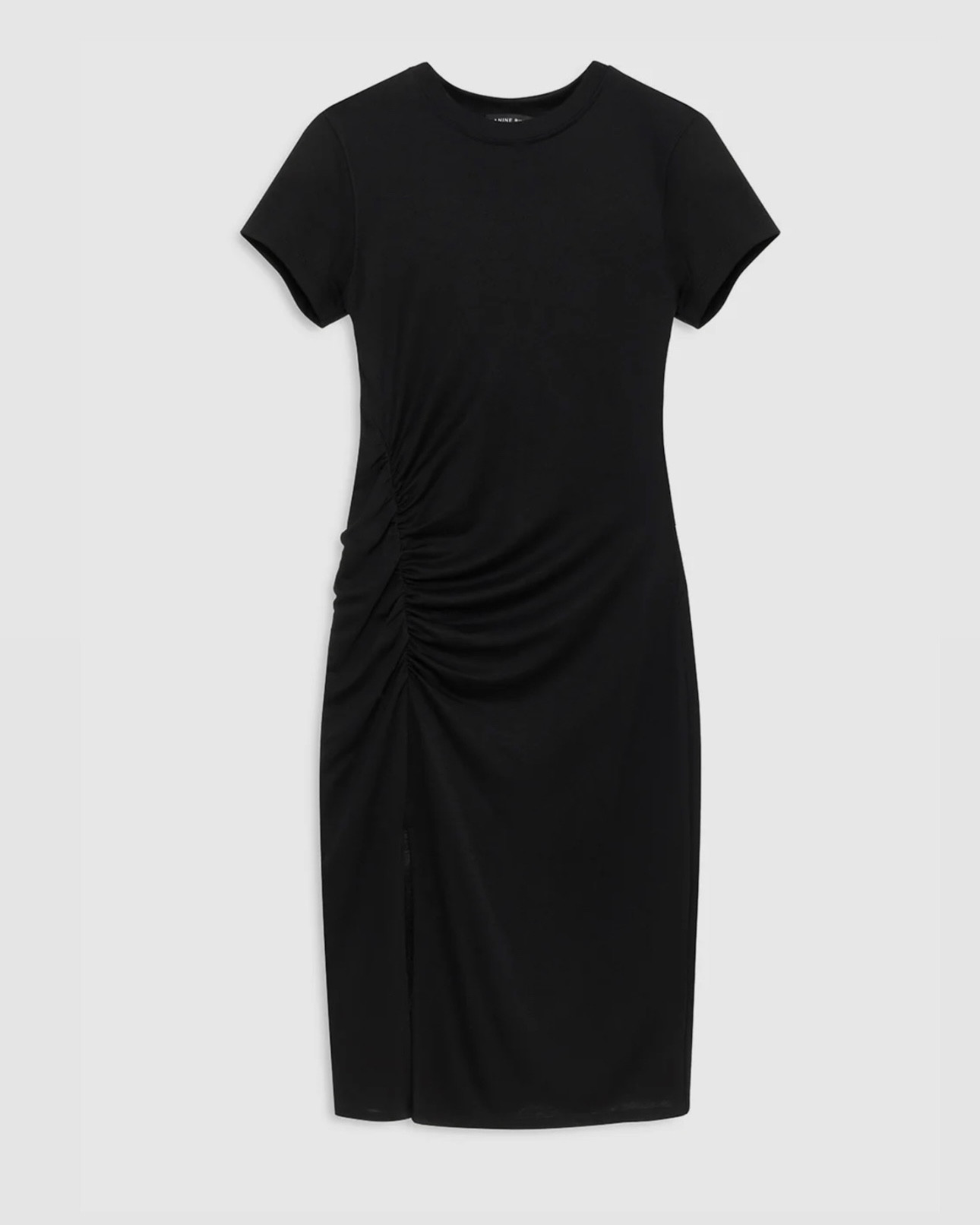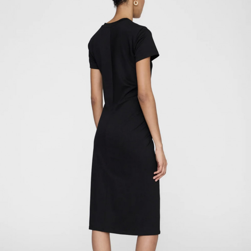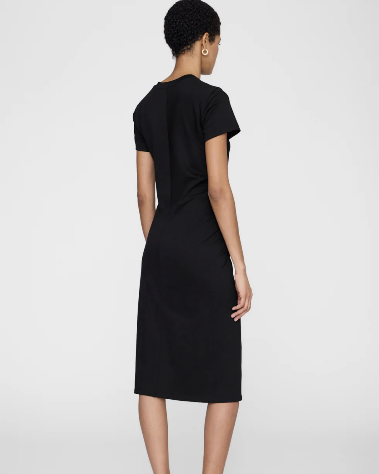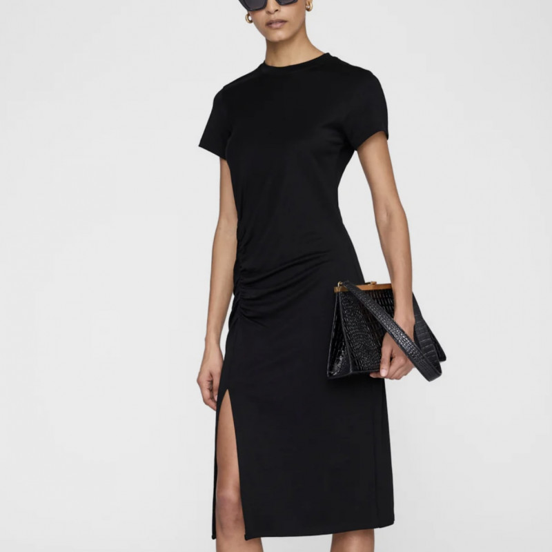 La robe midi noire essentielle, raffinée. Avec des fronces subtiles à la taille et une encolure ronde.