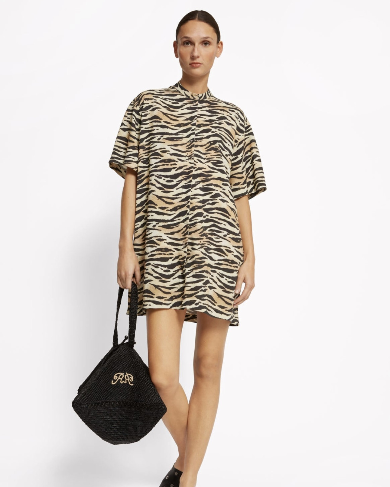 Cette robe t-shirt droite à manches courtes présente un col rond, une fermeture boutons pression, une broderie double RR ainsi qu'une longueur mi-cuisses.