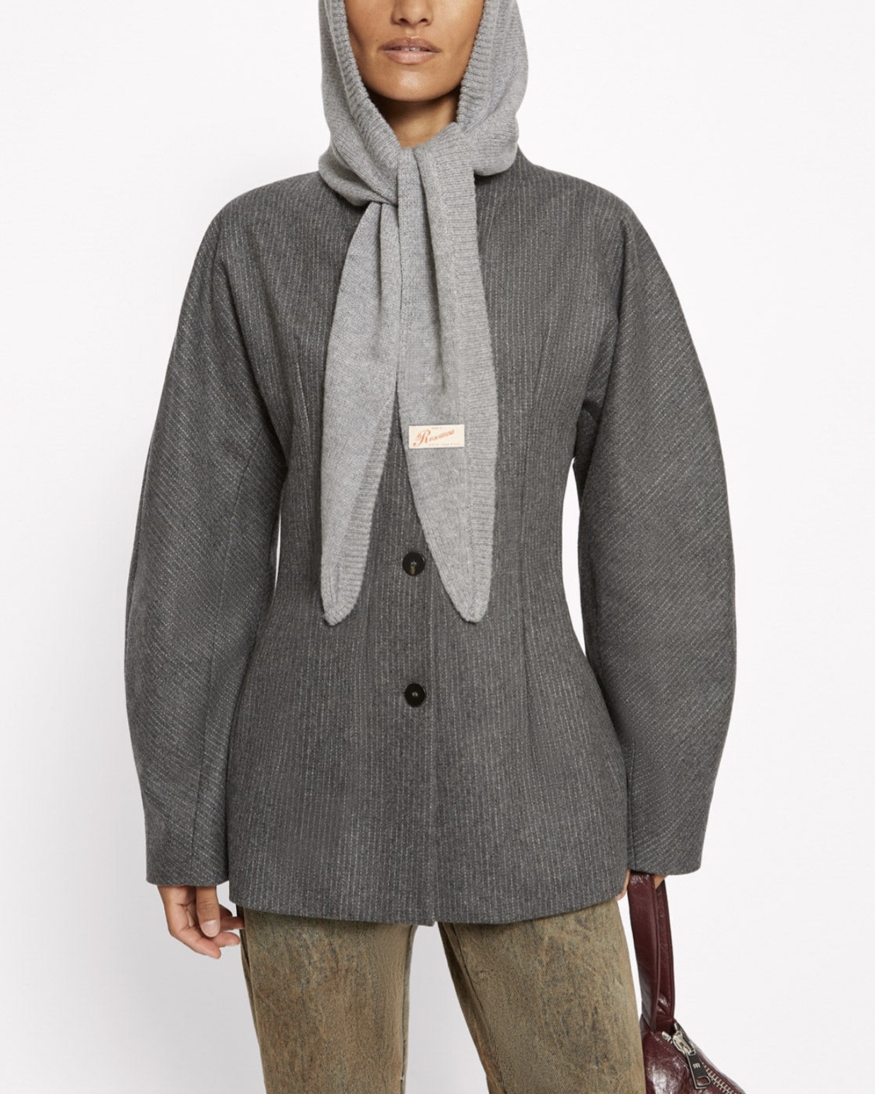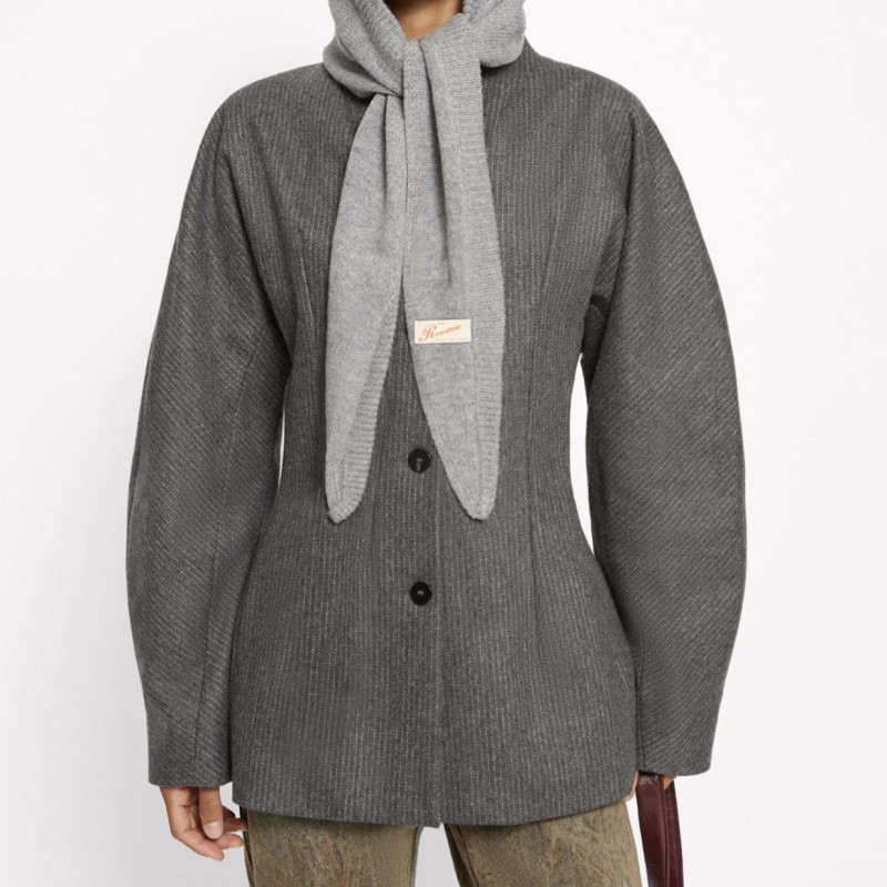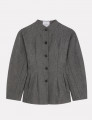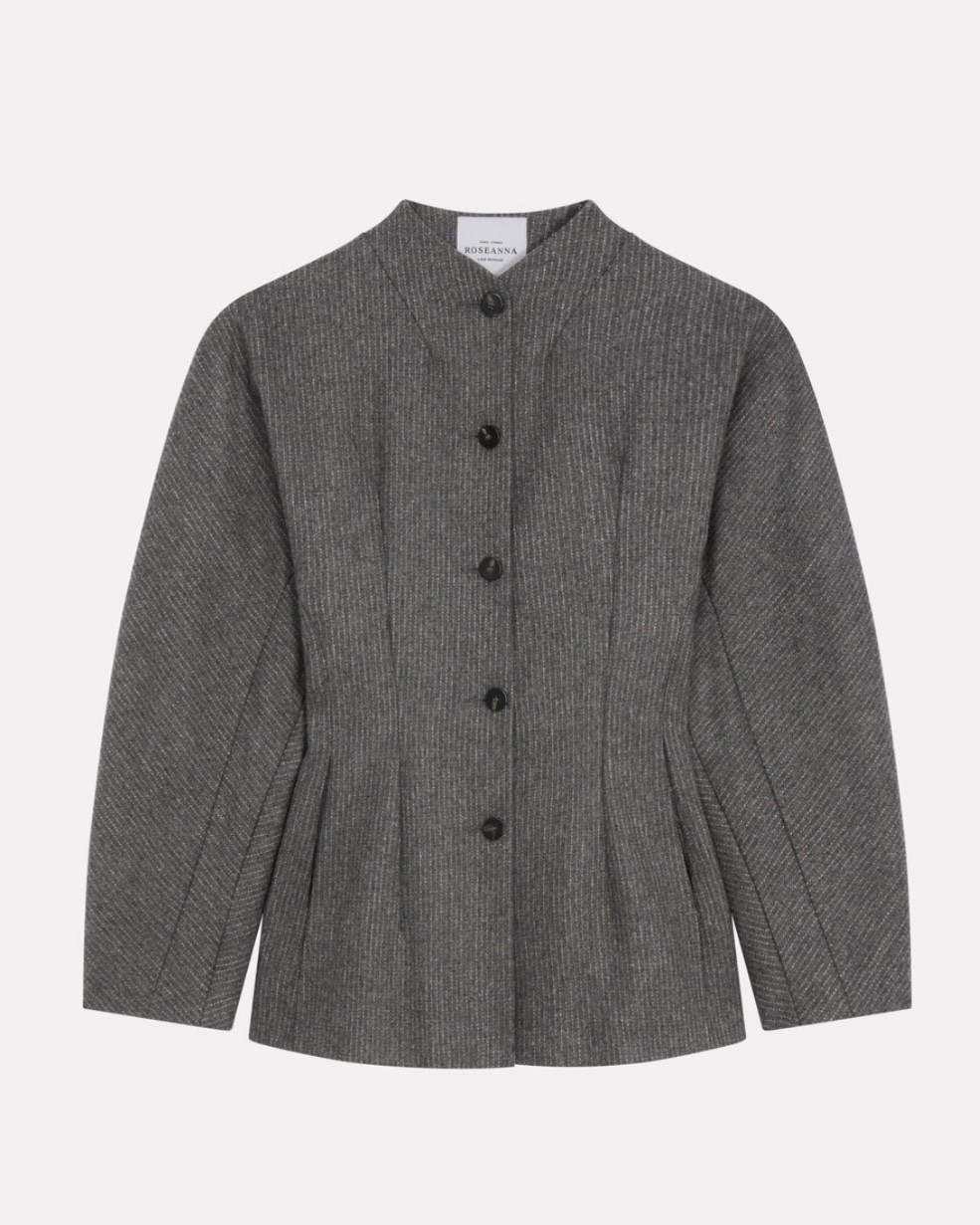 Veste cintrée en drap de laine italien à fines rayures ton sur ton, dotée de manches ballon et d’une fermeture boutonnée. Son volume ajusté structure la silhouette avec élégance et modernité.