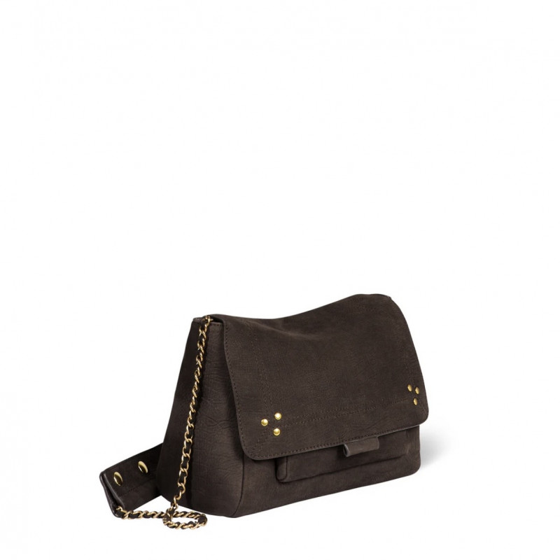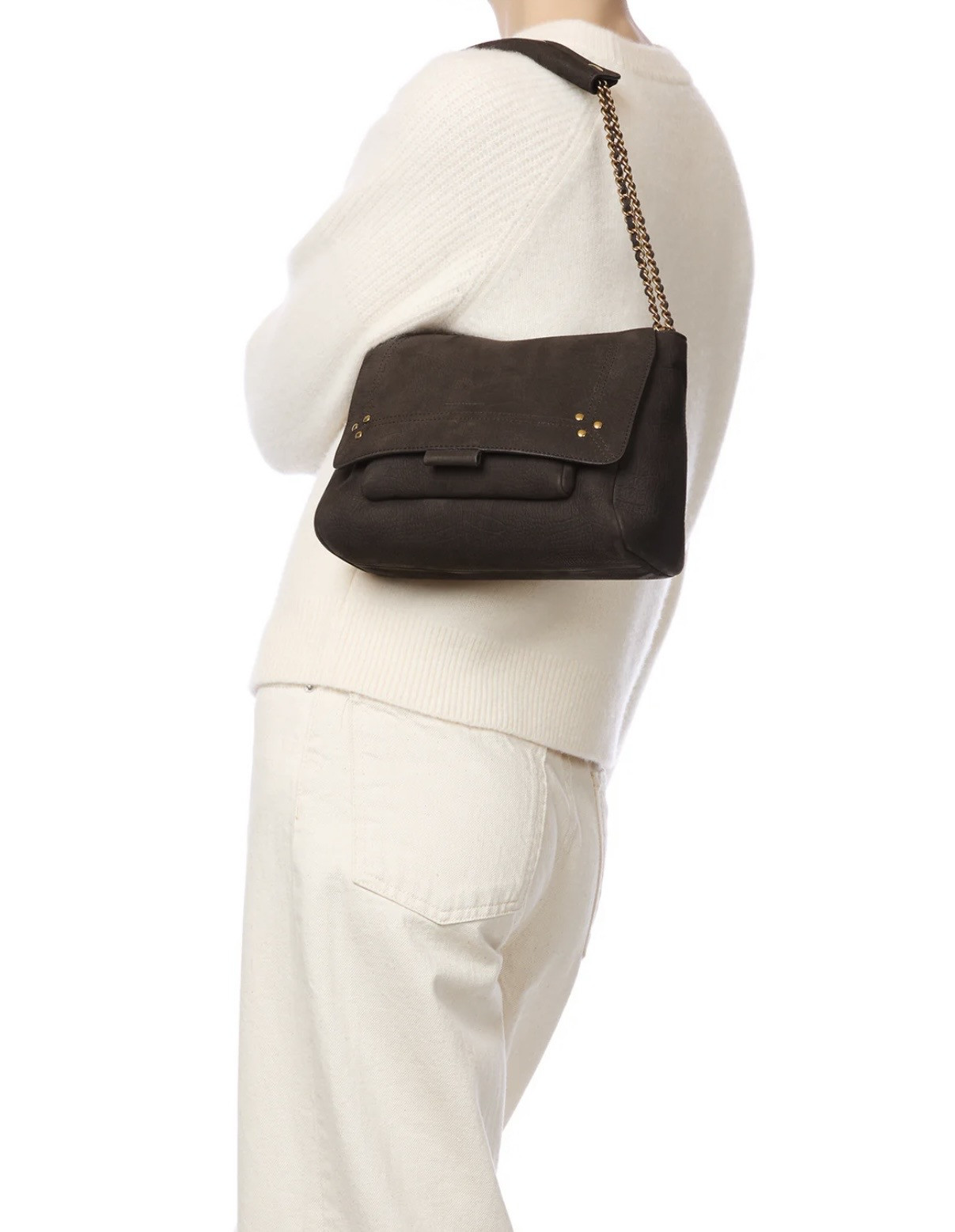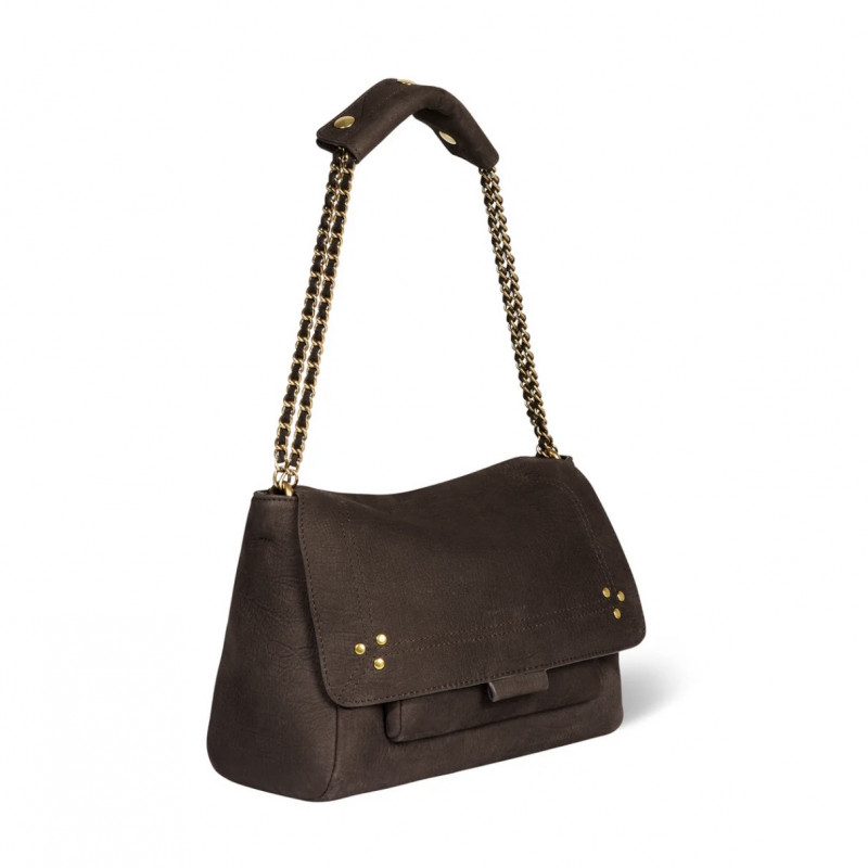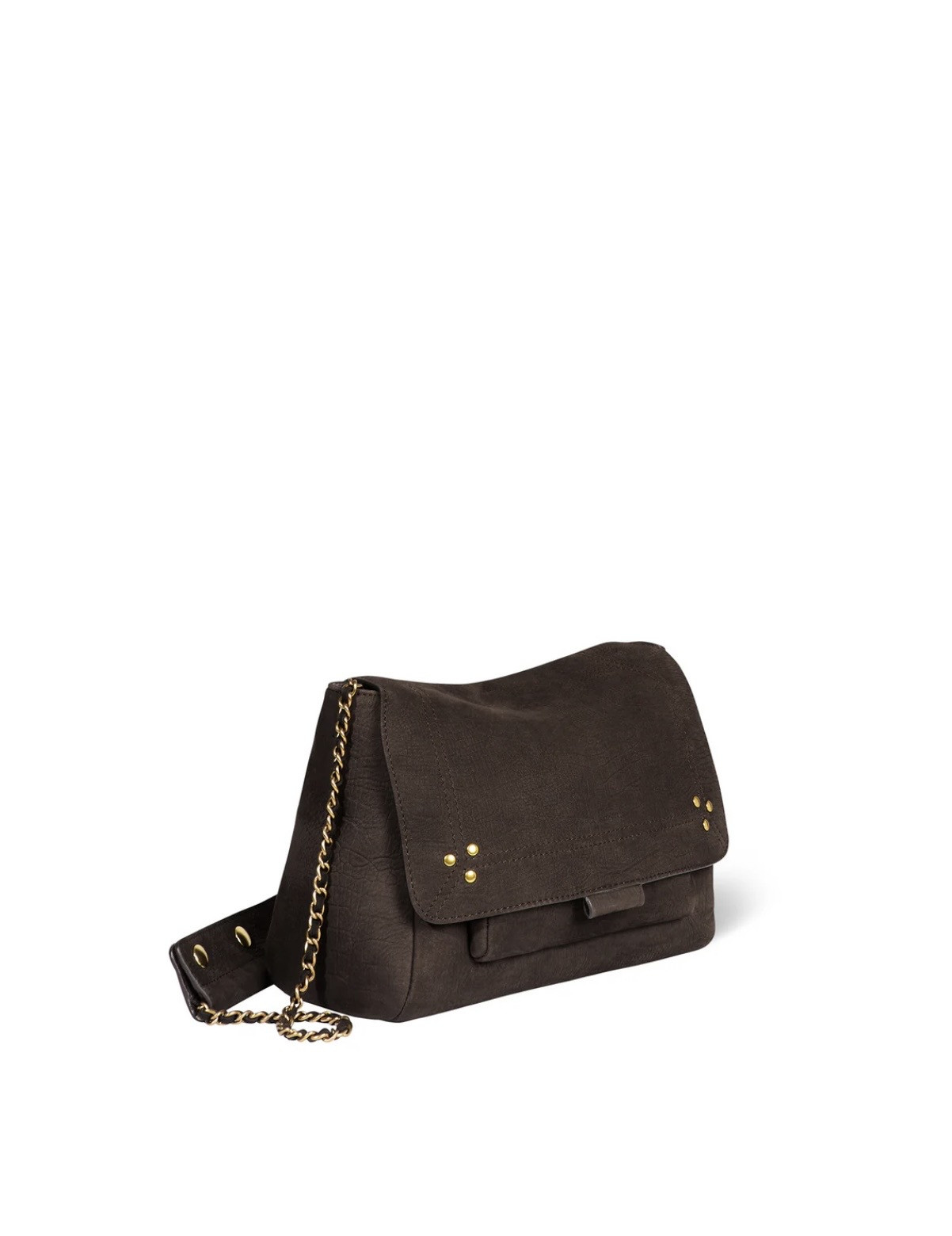 Sac besace, porté épaule ou croisé. Bandoulière chaîne et cuir, amovible et ajustable. Rabat avec fermeture aimantée.