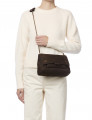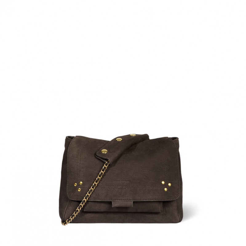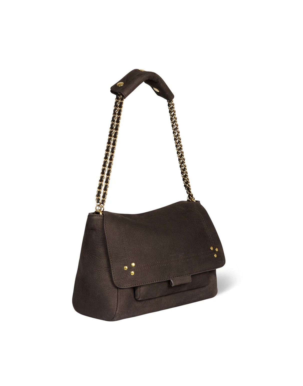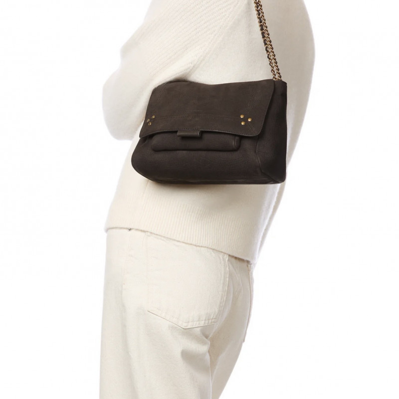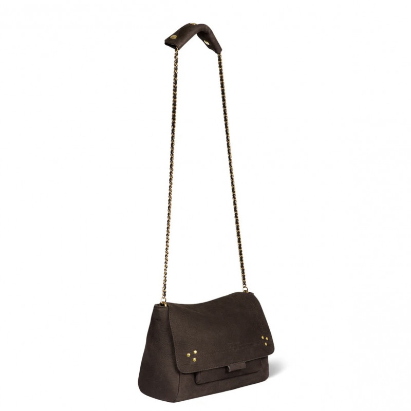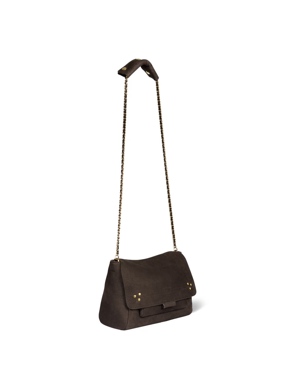 Sac besace, porté épaule ou croisé. Bandoulière chaîne et cuir, amovible et ajustable. Rabat avec fermeture aimantée.