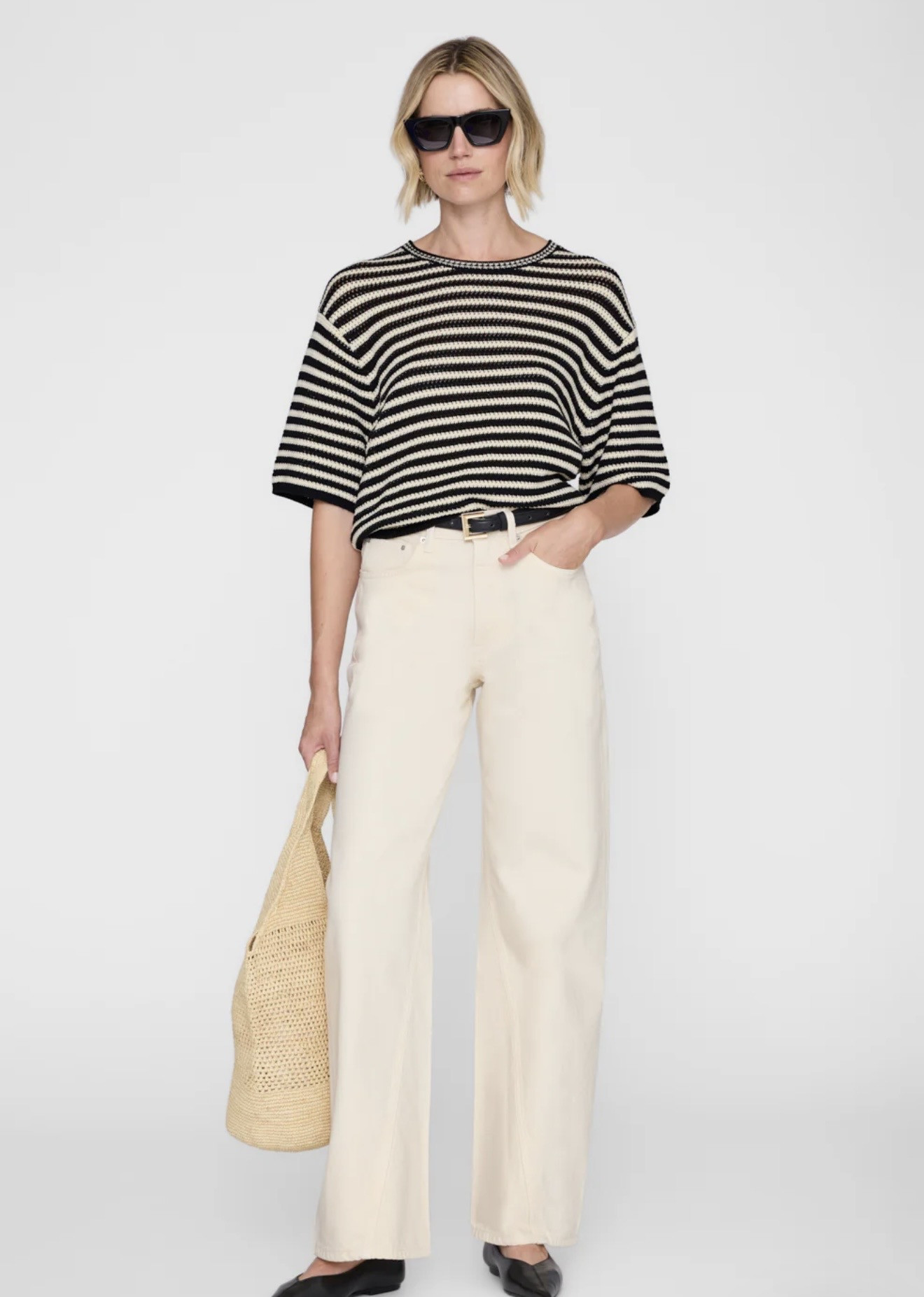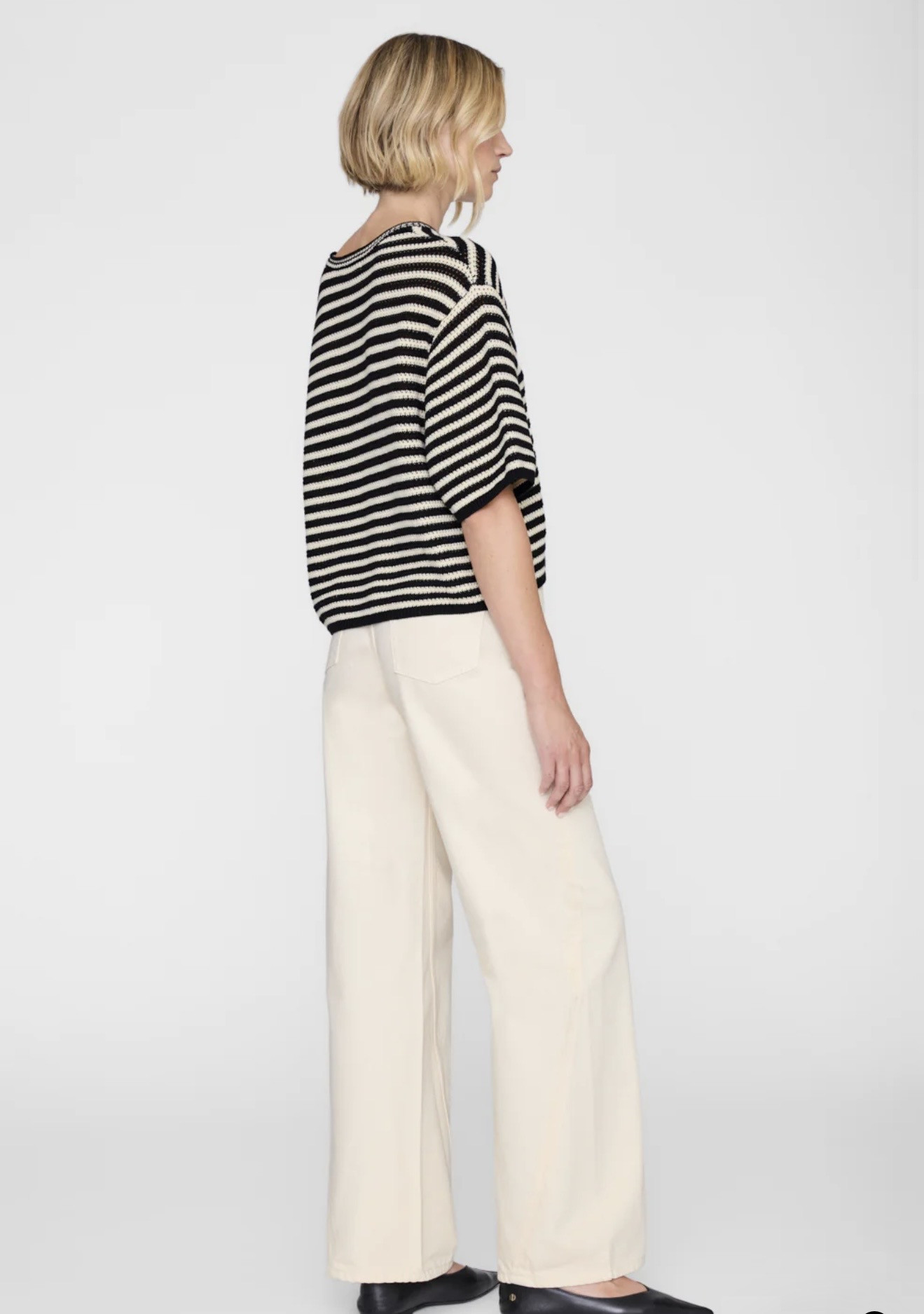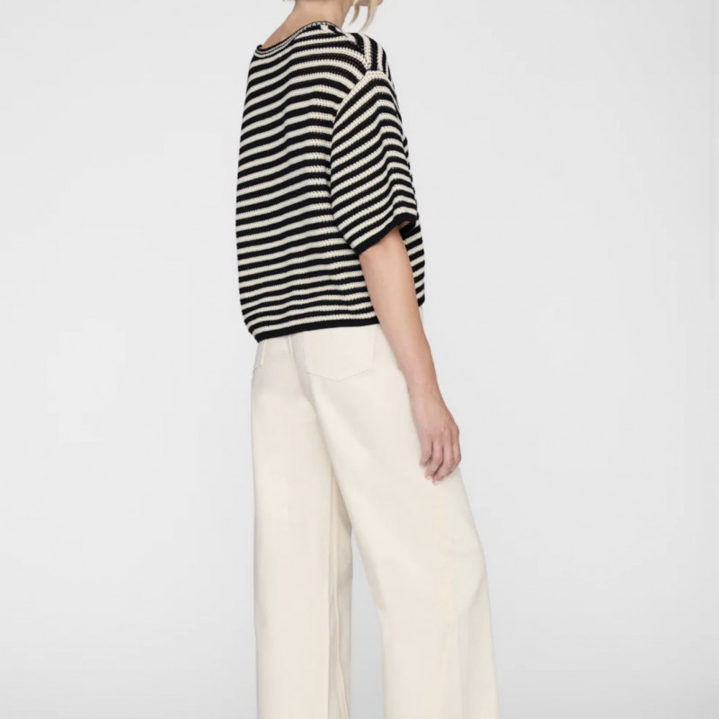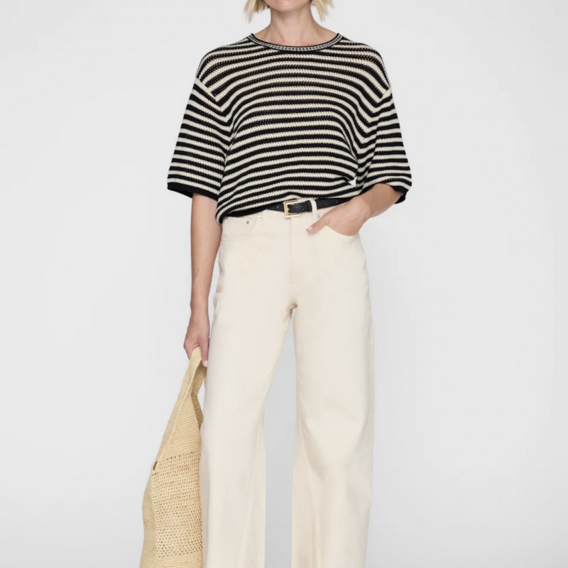 Le pull Theo dans une rayure noire et crème intemporelle. Décontracté à travers le corps avec un drapé doucement structuré et des proportions légèrement décolletées. C’est le genre de tricot qui équilibre un denim propre, une coupe soignée et des couches faciles sans trop essayer. Portez-le à moitié rentré, sur les épaules ou avec des neutres assortis pour un contraste discret.