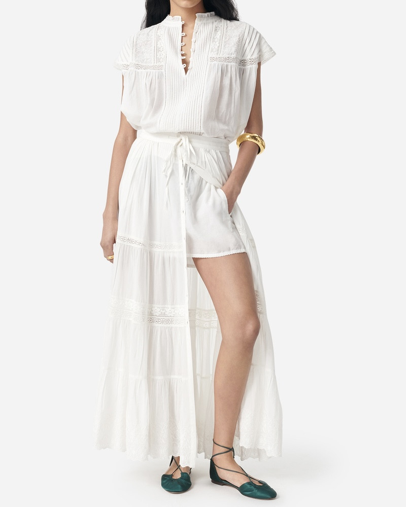 Fluide et légère, cette jupe longue à étages se distingue par son volume aérien qui accompagne le mouvement avec naturel. Elle est accompagnée d’un petit short amovible pour plus de confort et d’opacité.