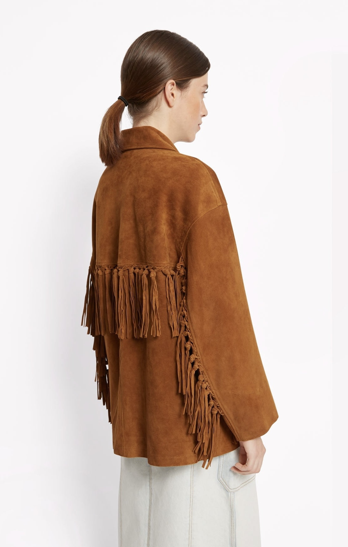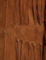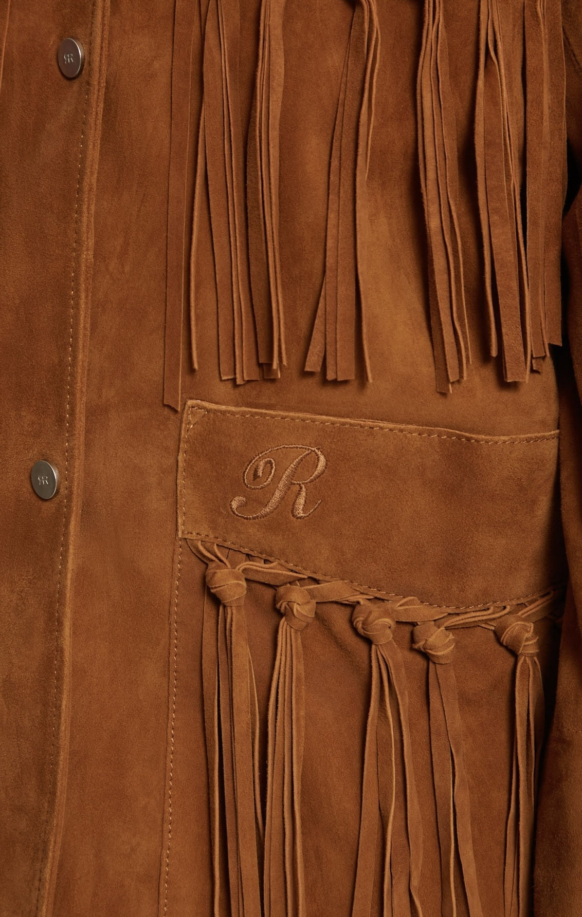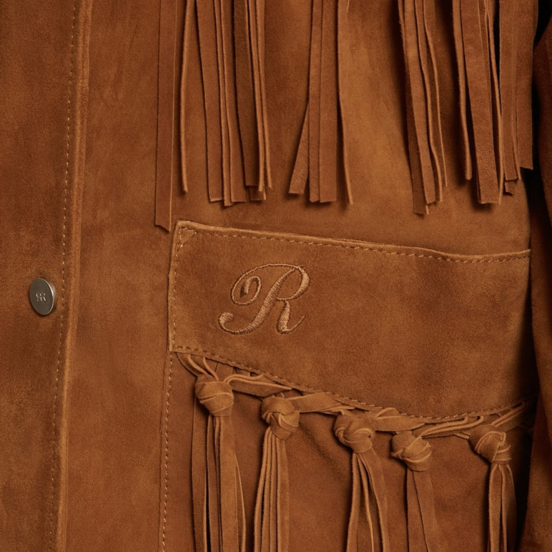Veste en cuir qui présente coupe droite généreuse, des détail de franges tressées ainsi qu'une broderie R poche gauche