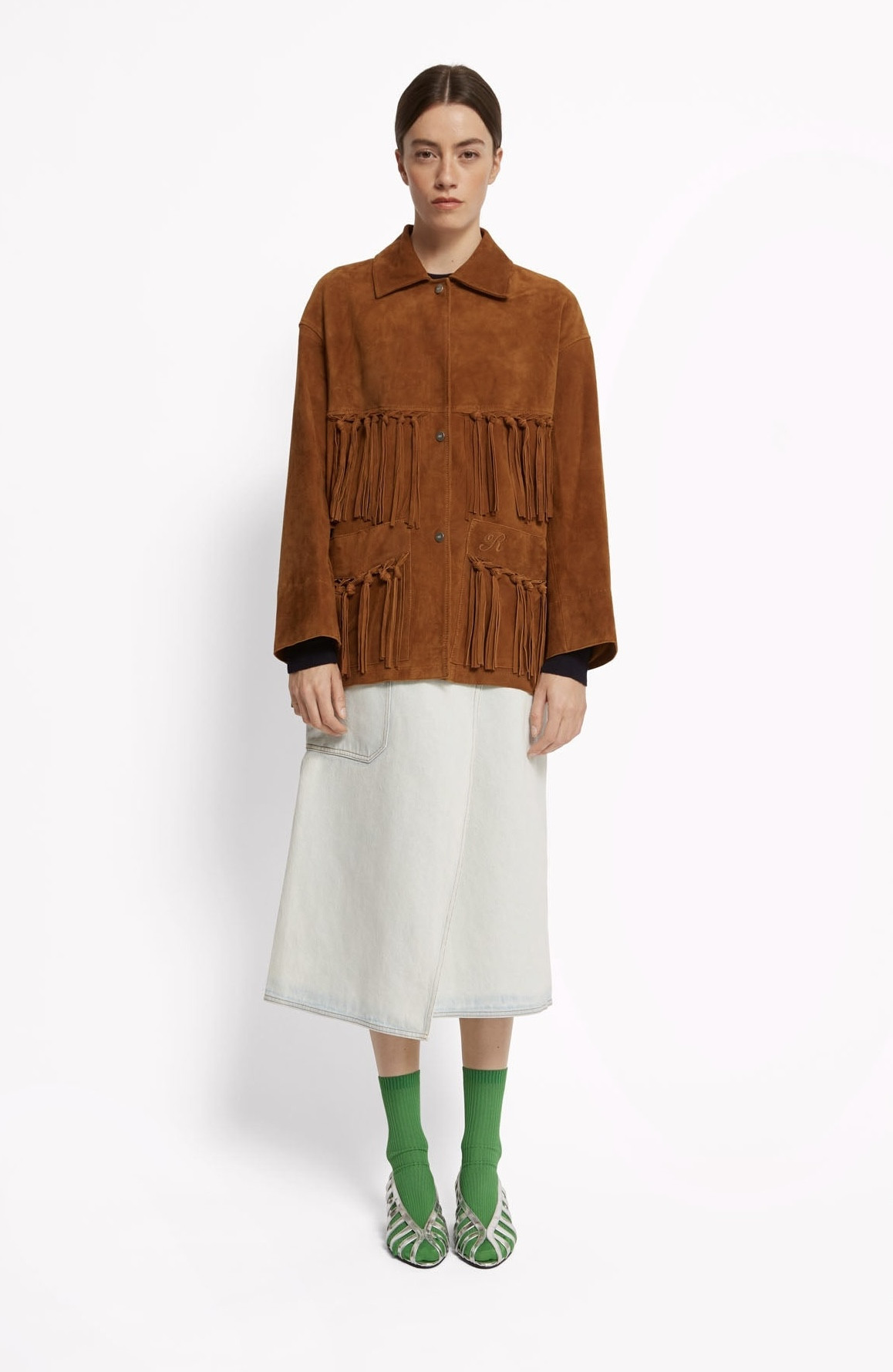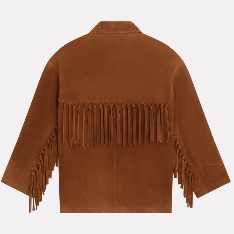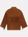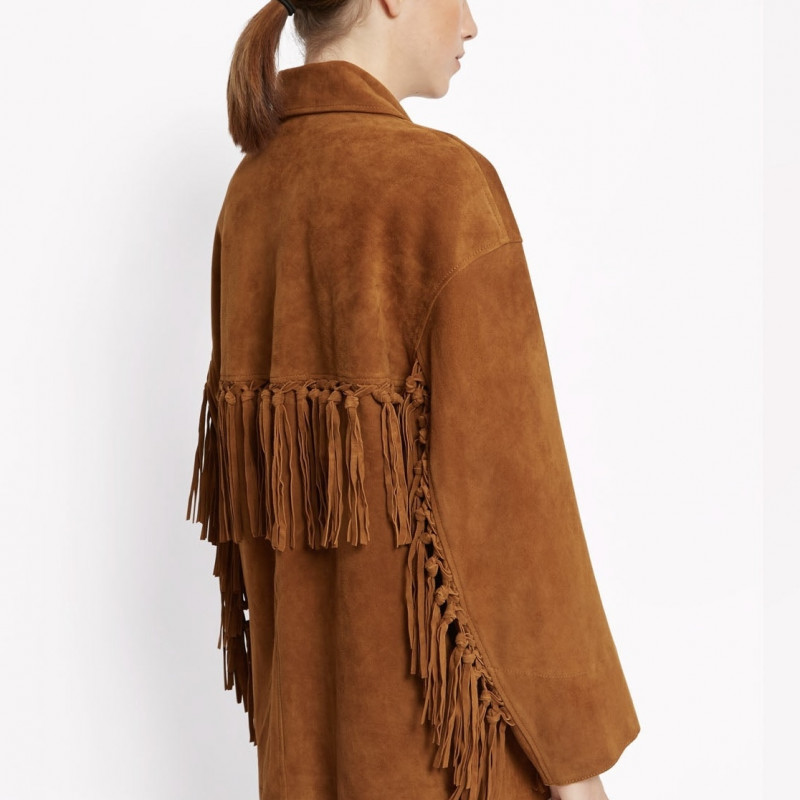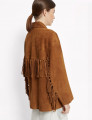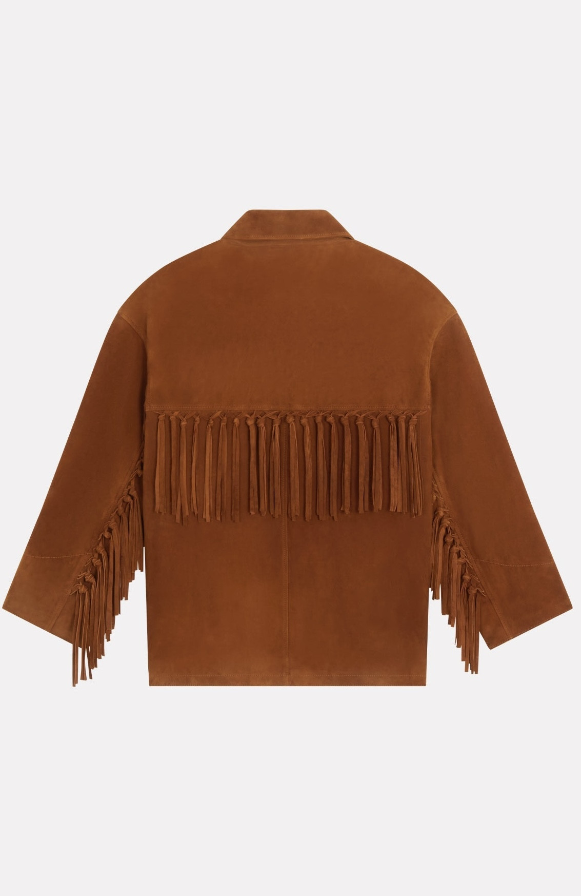 Veste en cuir qui présente coupe droite généreuse, des détail de franges tressées ainsi qu'une broderie R poche gauche