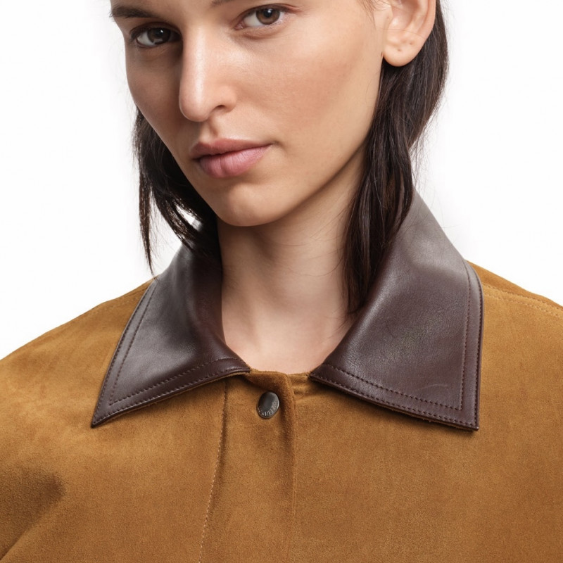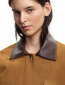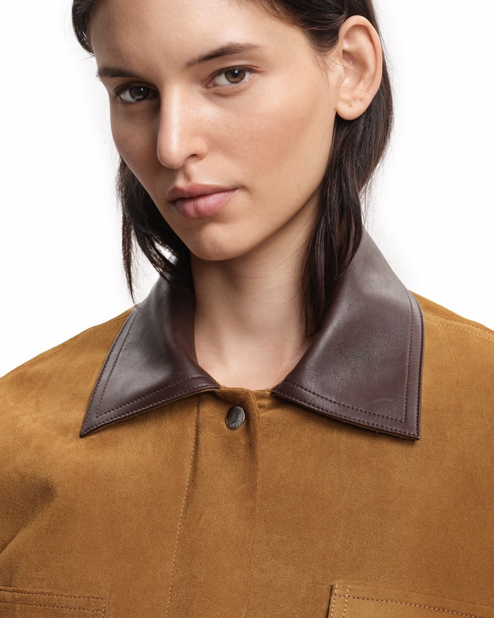 Veste en cuir de vachette véritable au coloris cognac profond, doublée pour un confort optimal, coupe droite et structurée avec col pointu, manches longues à plis au coude, fermeture éclair dissimulée sous patte, poche plaquée sur le devant et soufflet au dos pour une aisance de mouvement ; la mannequin mesure 1m77 et porte une taille 36.