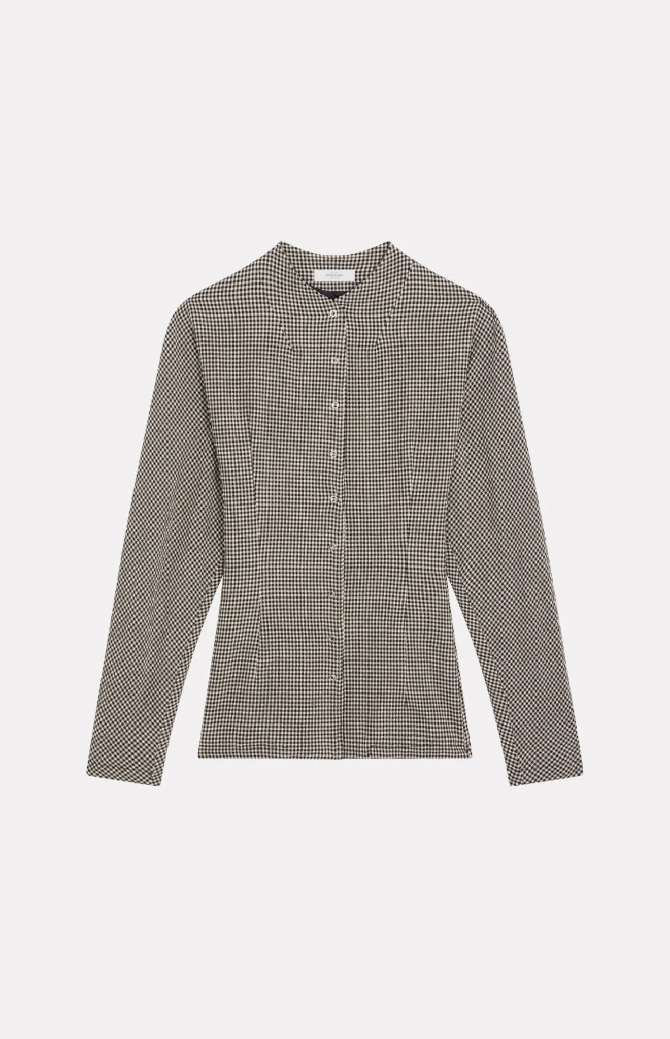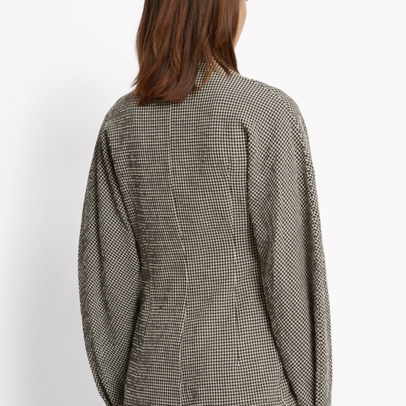 Une veste col rond à la coupe ajustée qui présente une taille appuyée, des manches ballon ainsi qu'une fermeture boutons.